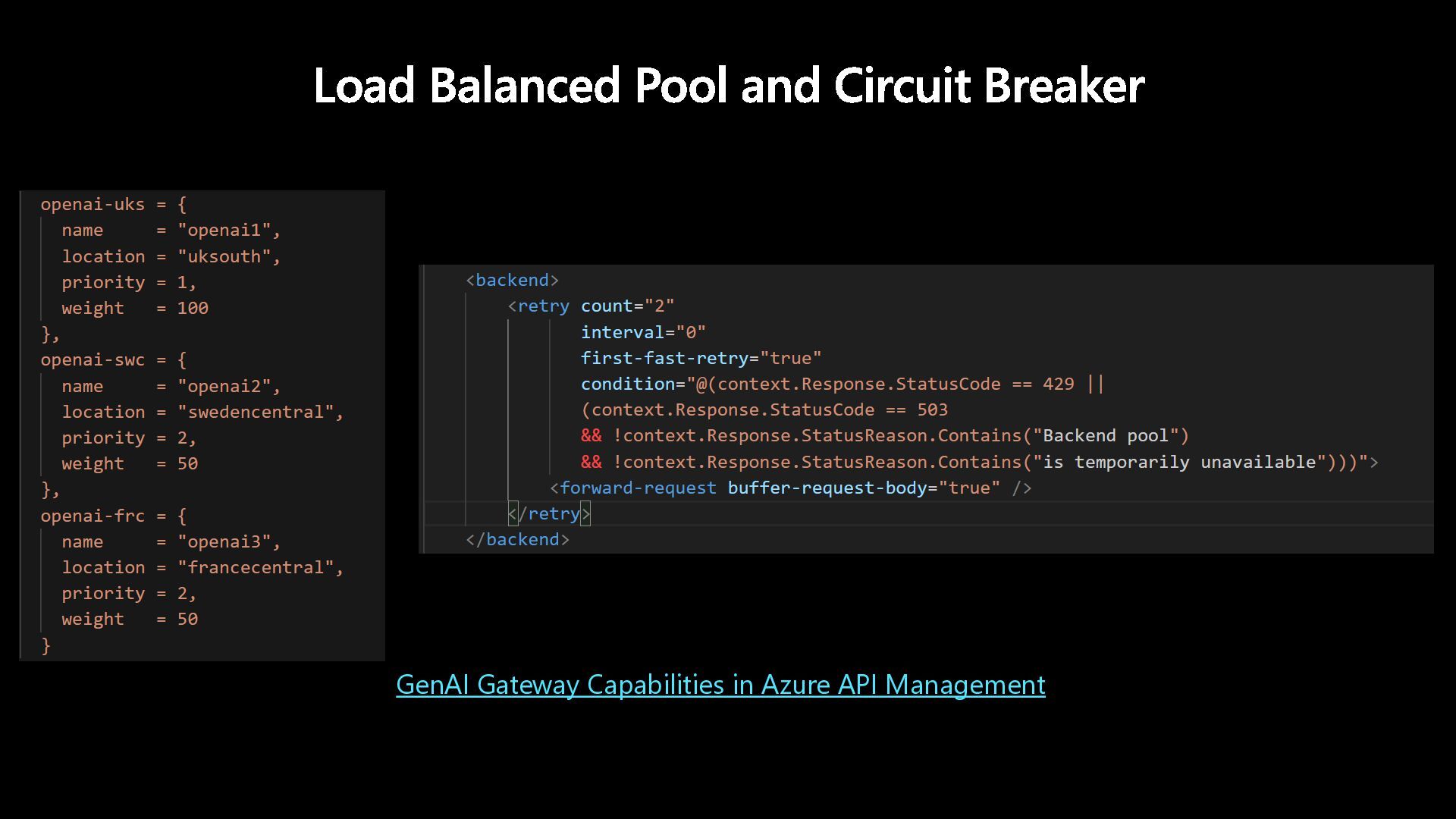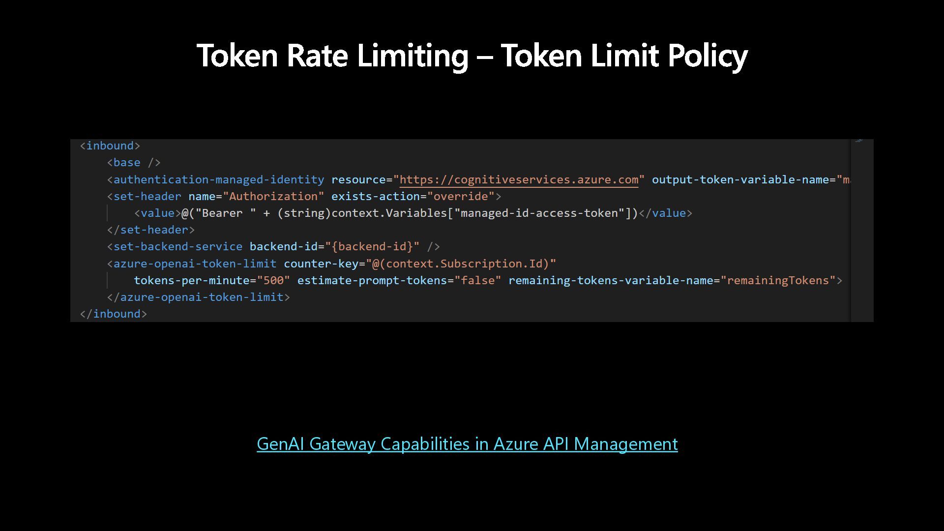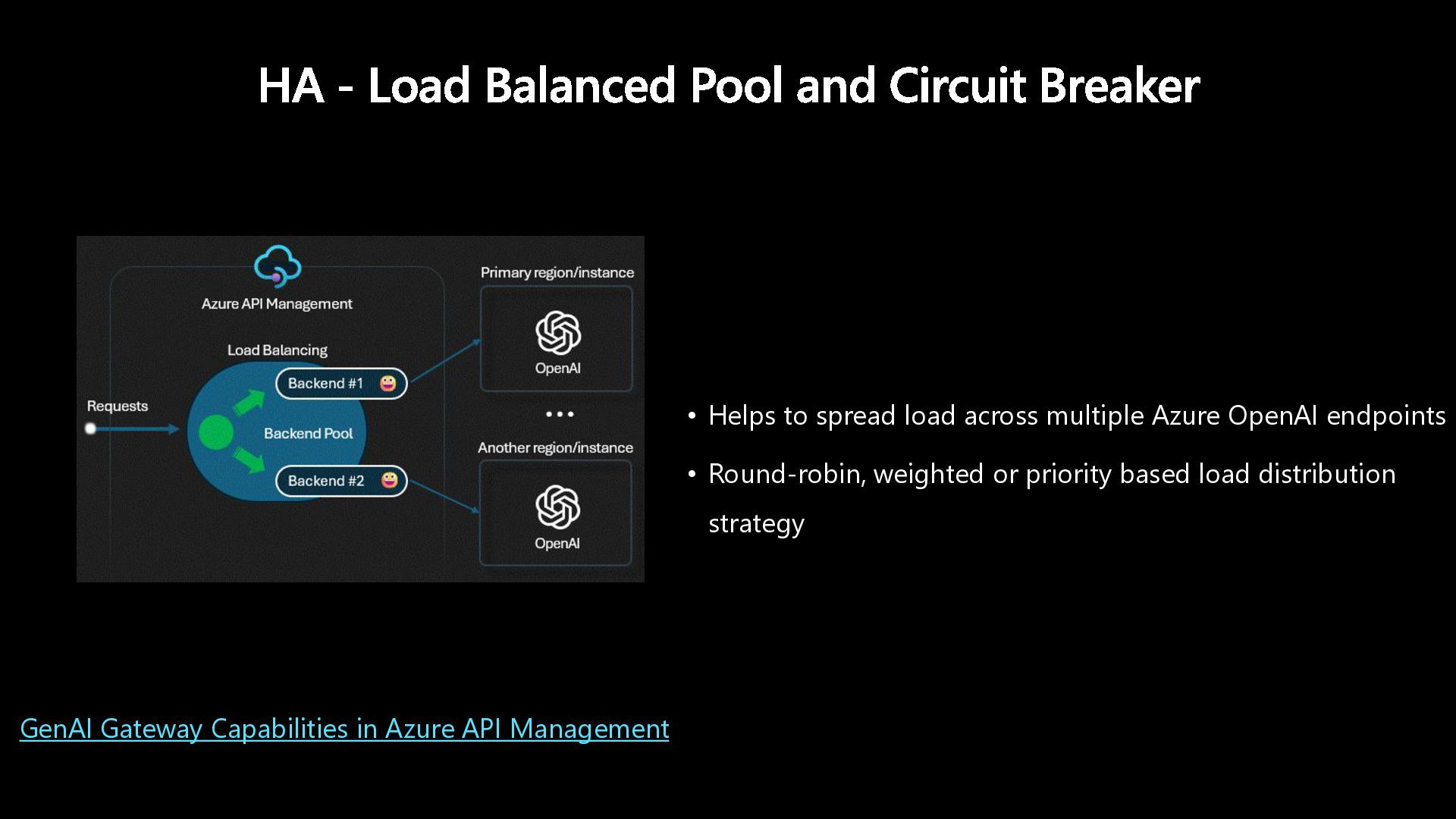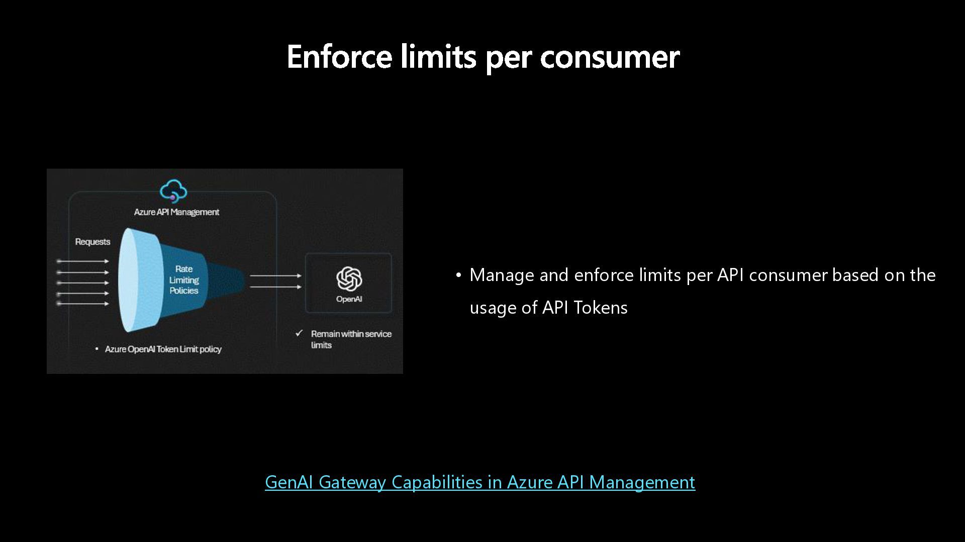 to spread load across multiple Azure OpenAI endpoints • Round-robin, weighted or priority based load distribution strategy GenAI Gateway Capabilities in Azure API Management