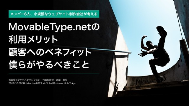 2019年10月8日に東京大手町「Global Business Hub Tokyo」で開催された SAtisfaction2019 でのパートナーセッション登壇時に使用したスライドです。 → イベント概要ほか https://www.sixapart.jp/satisfaction2019/