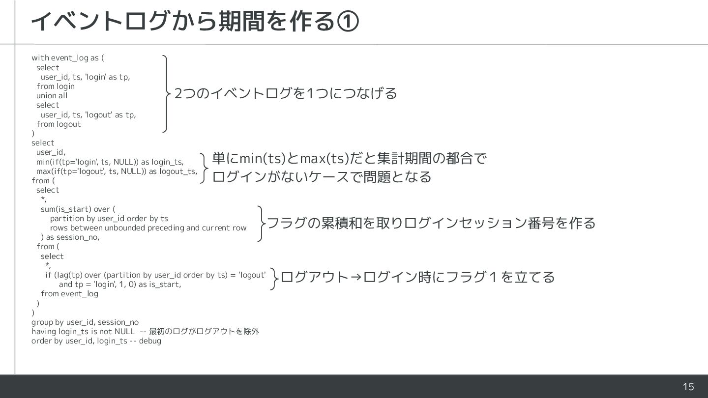 as tp, from login union all select user_id, ts, 'logout' as tp, from logout ) select user_id, min(if(tp='login', ts, NULL)) as login_ts, max(if(tp='logout', ts, NULL)) as logout_ts, from ( select *, sum(is_start) over ( partition by user_id order by ts rows between unbounded preceding and current row ) as session_no, from ( select *, if (lag(tp) over (partition by user_id order by ts) = 'logout' and tp = 'login', 1, 0) as is_start, from event_log ) ) group by user_id, session_no having login_ts is not NULL -- 最初のログがログアウトを除外 order by user_id, login_ts -- debug 2つのイベントログを1つにつなげる ログアウト→ログイン時にフラグ1を立てる フラグの累積和を取りログインセッション番号を作る 単にmin(ts)とmax(ts)だと集計期間の都合で ログインがないケースで問題となる