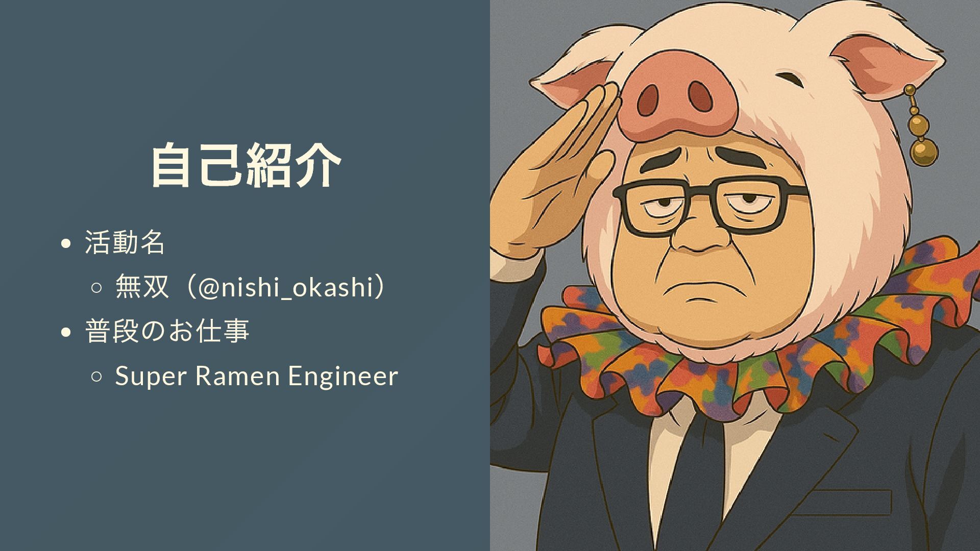 自己紹介 活動名 無双(@nishi_okashi ) 普段のお仕事 Super Ramen Engineer