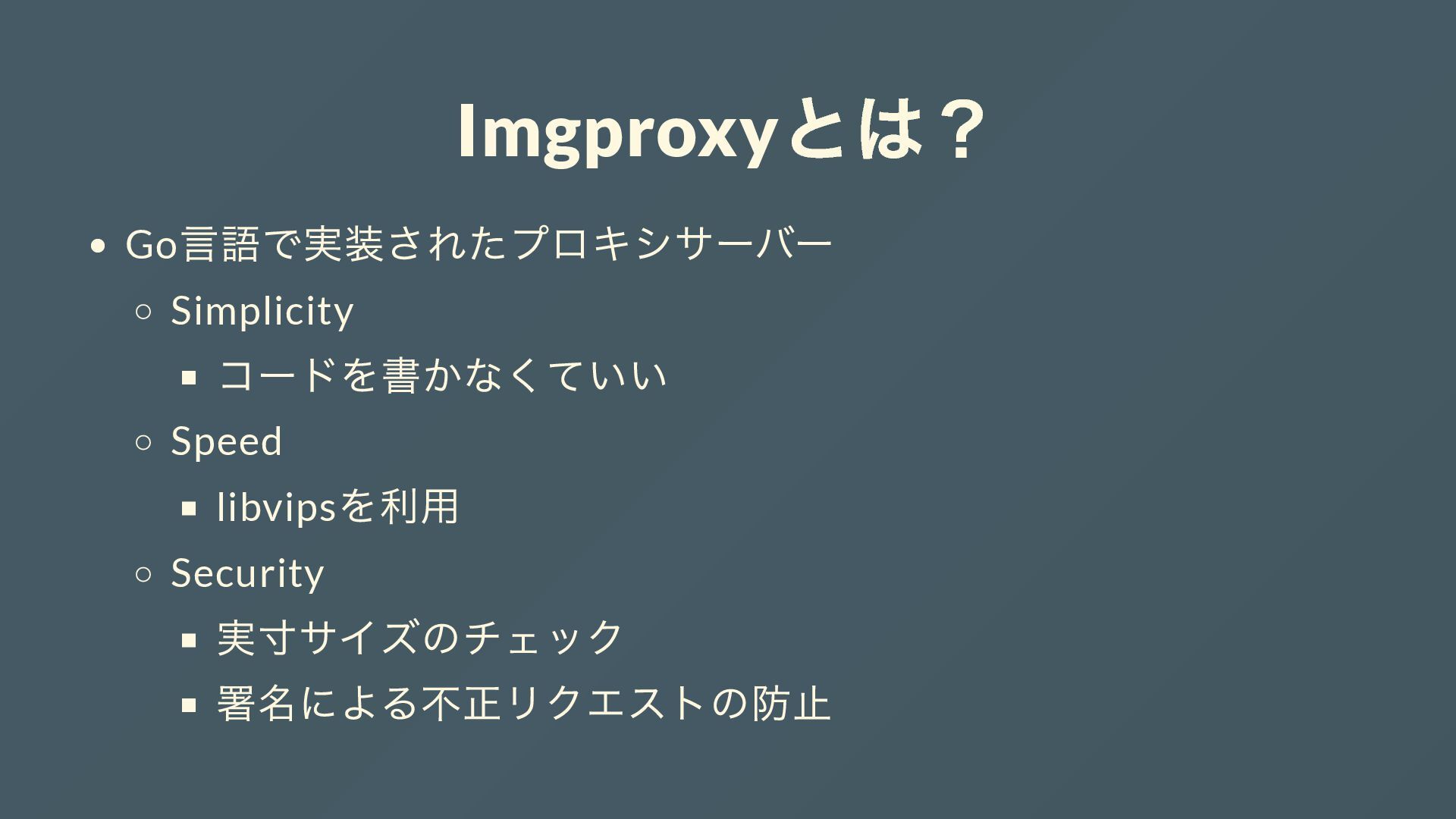 Imgproxy とは? Go 言語で実装されたプロキシサーバー Simplicity コードを書かなくていい Speed libvips を利用 Security