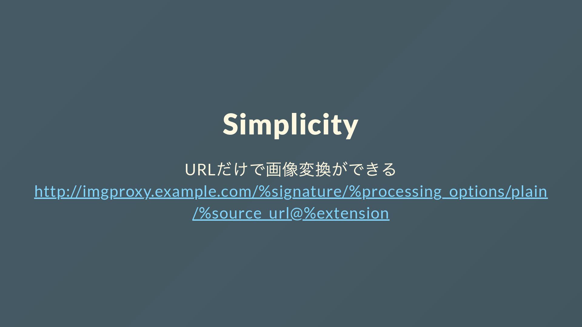 Simplicity URL だけで画像変換ができる http://imgproxy.example.com/%signature/%processing_options/plain /%source_url@%extension