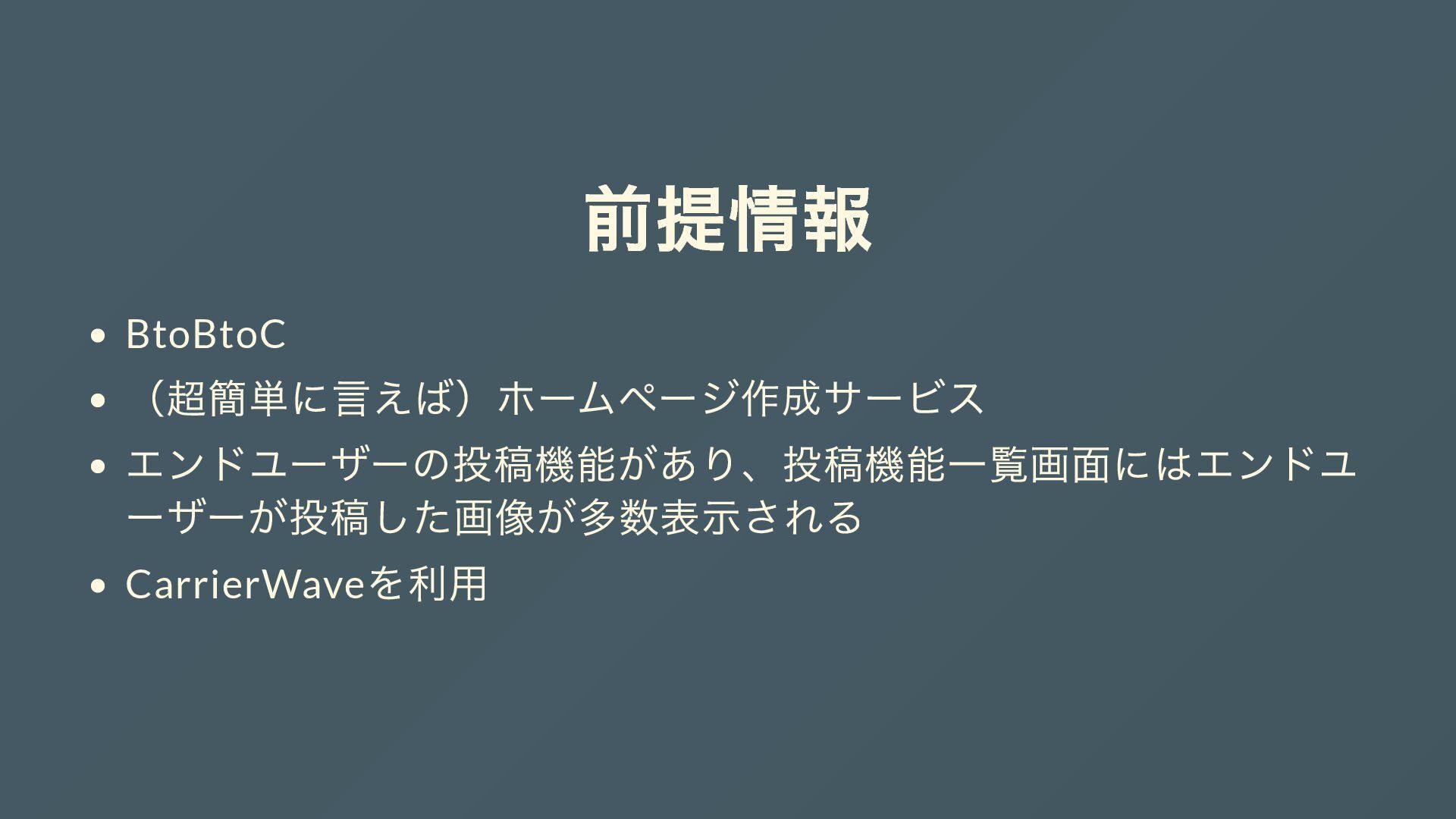前提情報 BtoBtoC (超簡単に言えば)ホームページ作成サービス エンドユーザーの投稿機能があり、投稿機能一覧画面にはエンドユ ーザーが投稿した画像が多数表示される CarrierWave を利用