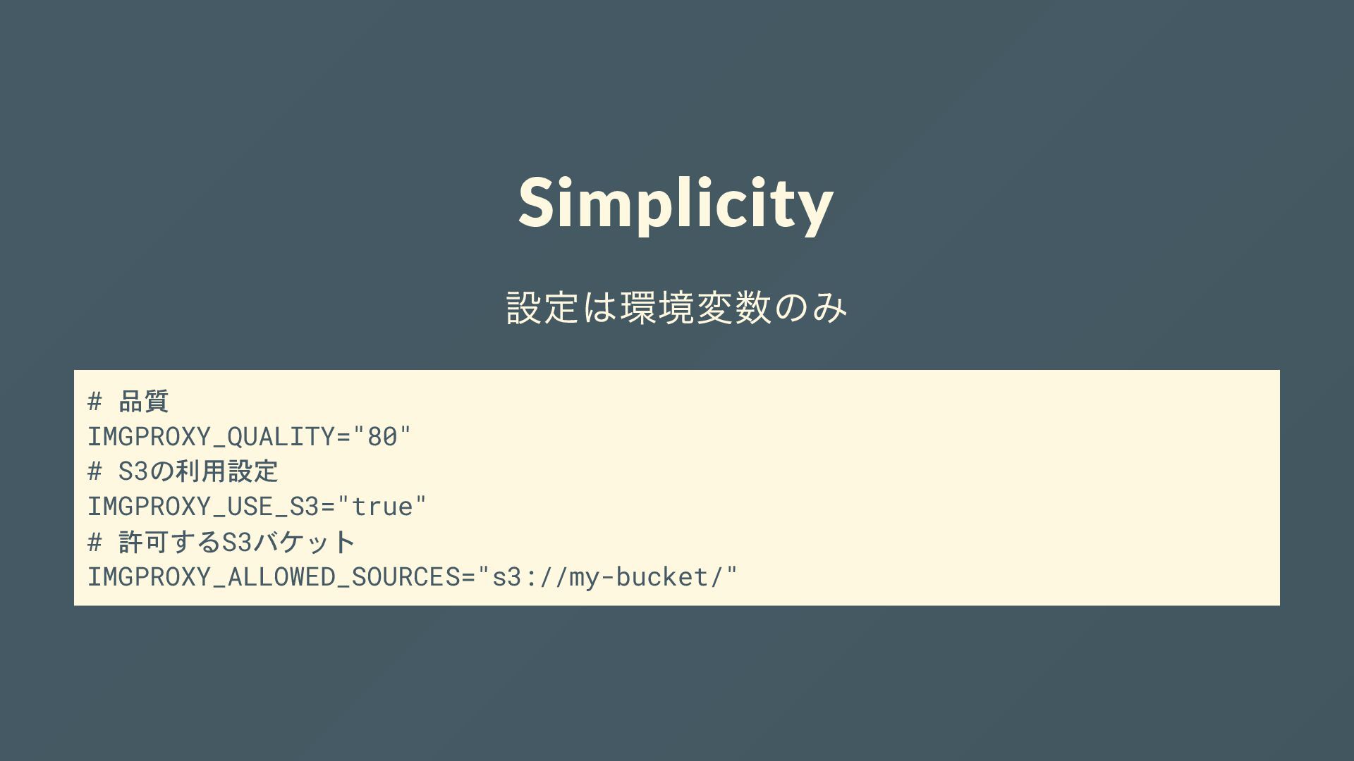 Simplicity 設定は環境変数のみ # 品質 IMGPROXY_QUALITY="80" # S3の利用設定 IMGPROXY_USE_S3="true" # 許可するS3バケット