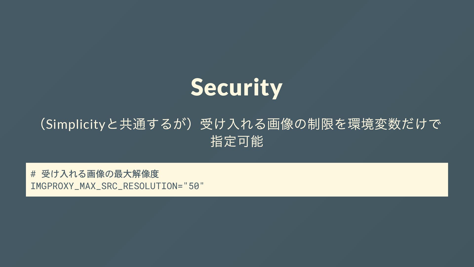 Security (Simplicity と共通するが)受け入れる画像の制限を環境変数だけで 指定可能 # 受け入れる画像の最大解像度 IMGPROXY_MAX_SRC_RESOLUTION="50"