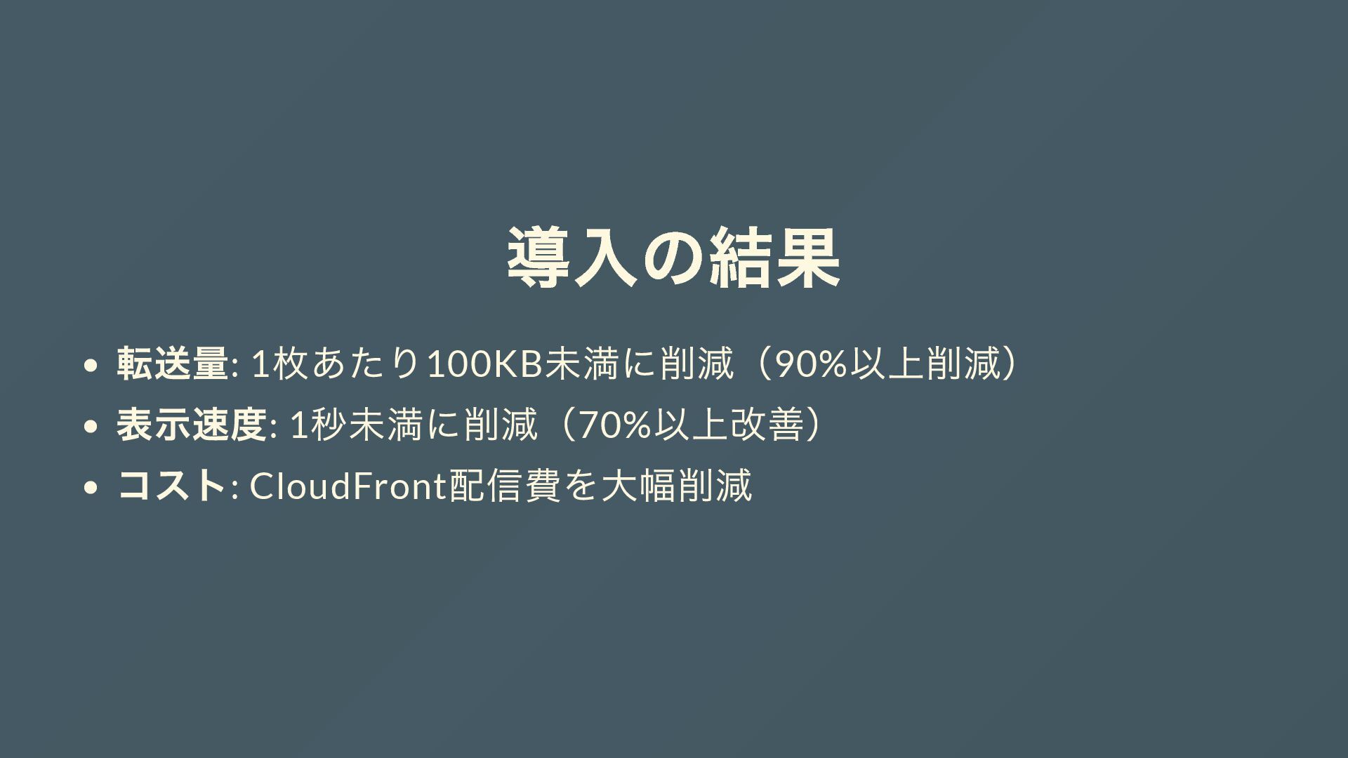 まとめ 問題: オリジナル画像配信による高コスト・表示遅延・大容量転送 解決策: Imgproxy(OSS) による動的画像最適化 結果: 90% 以上の転送量削減、70% 以上の速度改善