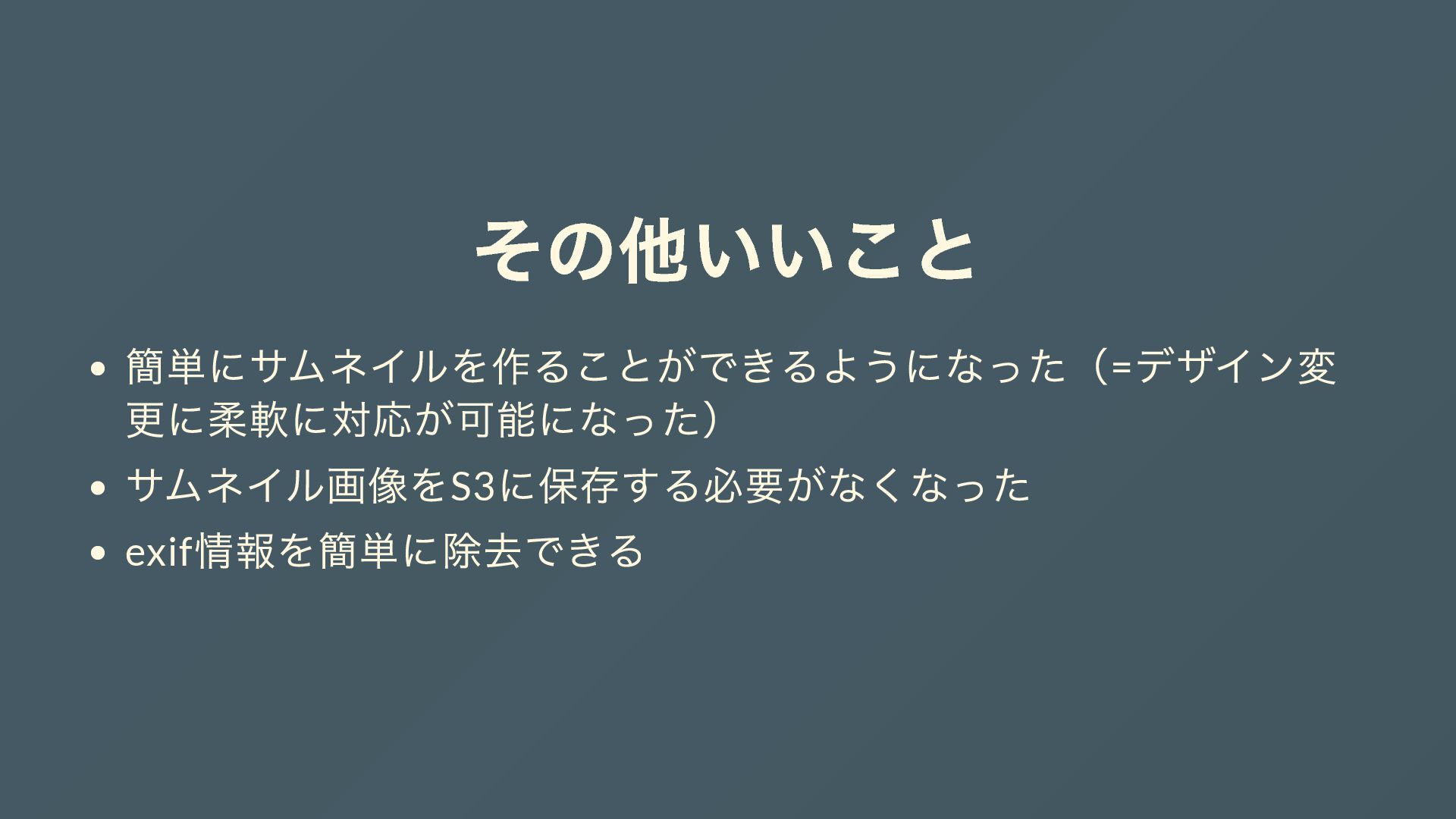 その他いいこと 簡単にサムネイルを作ることができるようになった(= デザイン変 更に柔軟に対応が可能になった) サムネイル画像をS3 に保存する必要がなくなった exif 情報を簡単に除去できる