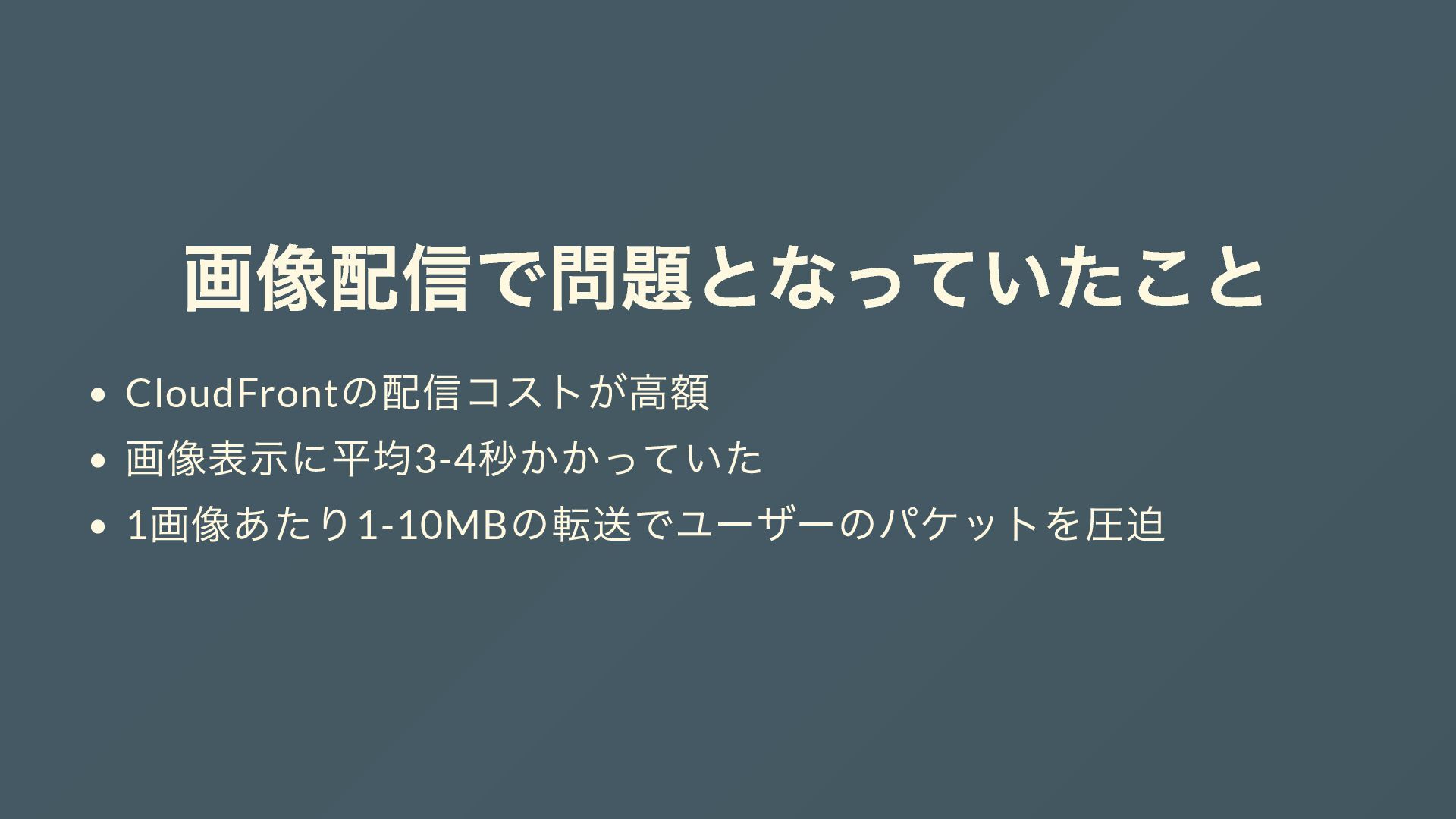 画像配信で問題となっていたこと CloudFront の配信コストが高額 画像表示に平均3-4 秒かかっていた 1 画像あたり1-10MB の転送でユーザーのパケットを圧迫