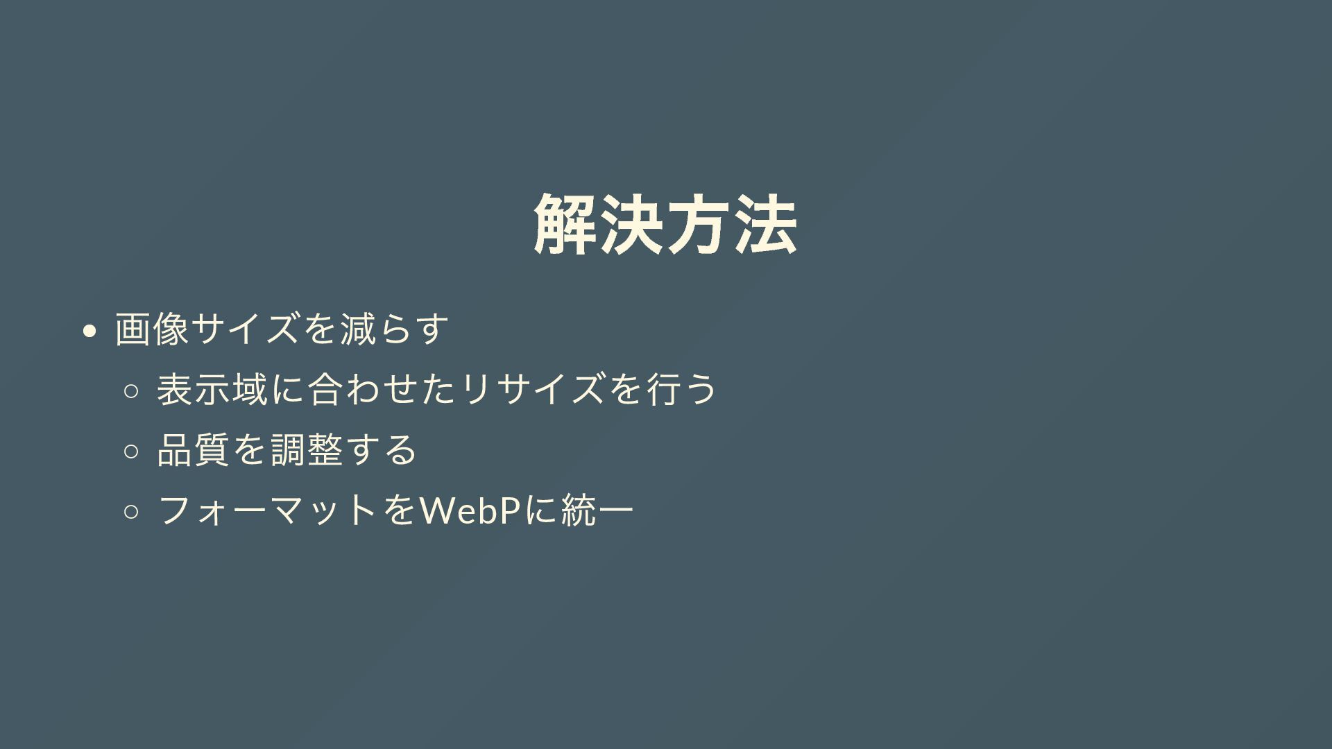 解決方法 画像サイズを減らす 表示域に合わせたリサイズを行う 品質を調整する フォーマットをWebP に統一