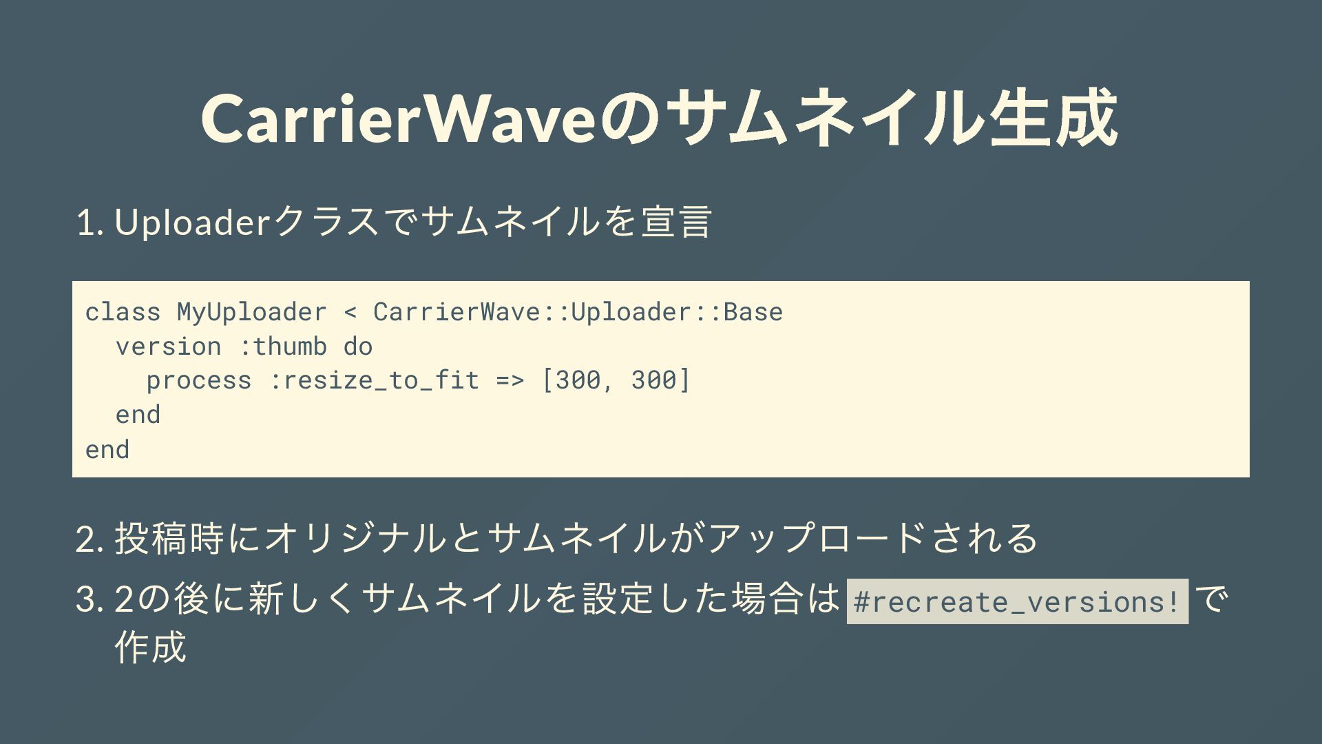 CarrierWave のサムネイル生成 1. Uploader クラスでサムネイルを宣言 class MyUploader < CarrierWave::Uploader::Base version