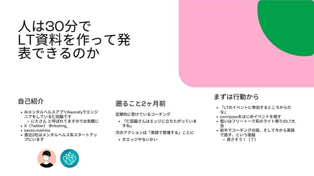 で話す、という座組 良さそう!(?) 遡ること2 ヶ月前 定期的に受けているコーチング 「仁田脇さんはエッジに立ちたがっていま すね」 次のアクションは「英語で登壇する」ことに 大エッジやないかい 自己紹介 AI メンタルヘルスアプリAwarefy でエンジ ニアをしている仁田脇です にたさん と呼ばれてますのでお気軽に X (Twitter ) @nitaking_ bento.me/nita 直近2 社はメンタルヘルス系スタートアッ プにいます 人は30 分で LT 資料を作って発 表できるのか