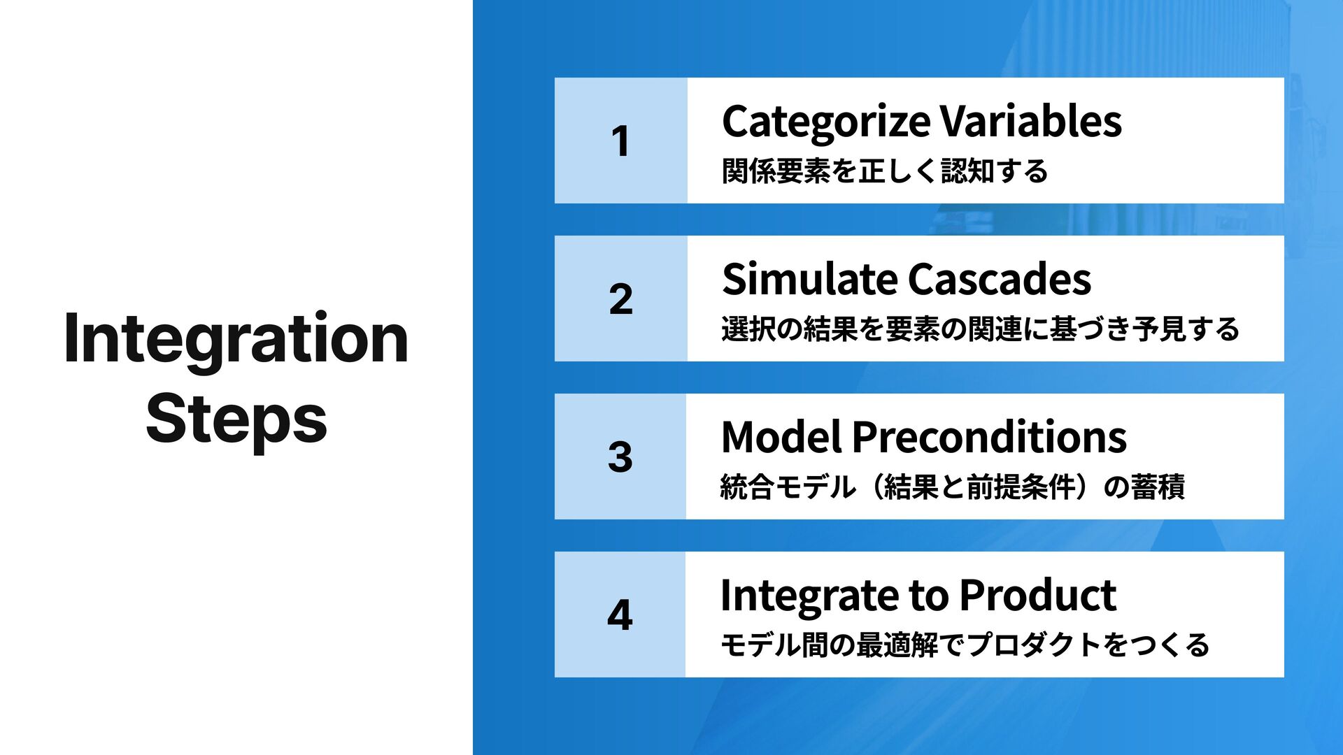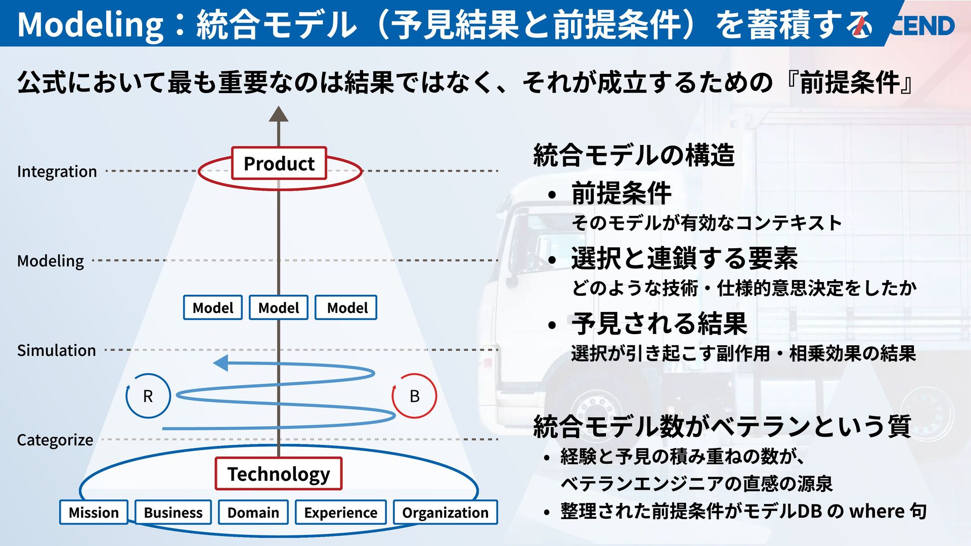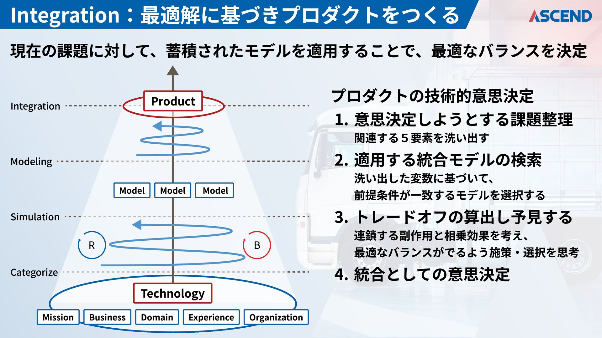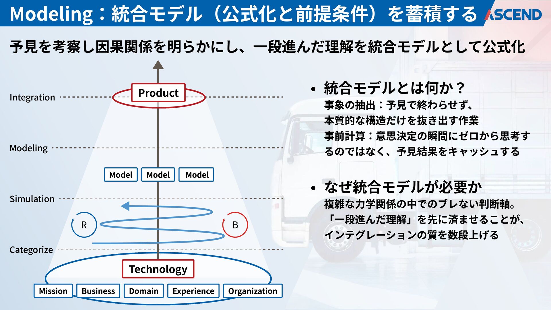 tegr ati on Mode ling Simul ation Cate g o r i ze Te chnol ogy Miss ion Busine ss Do ma in Ex perie nce Organization Mo del Mo del M od el Produ ct ‹‰™ßW àœ¢Â™› Kk W µ2 fi `ã ™qâ Çëh Wfl 統合モデルと は何か? 事象の抽出:予見で終わらせず、 本質的な構造だけを抜き出す作業 事前計算:意思決定の瞬間にゼロから思考す るのではなく、予見結果をキャッシュする なぜ統合モデルが必要か 複雑な力学関係の中でのブレない判断軸。 「一段進んだ理解」を先に済ませることが、 インテグレーションの質を数段上げ