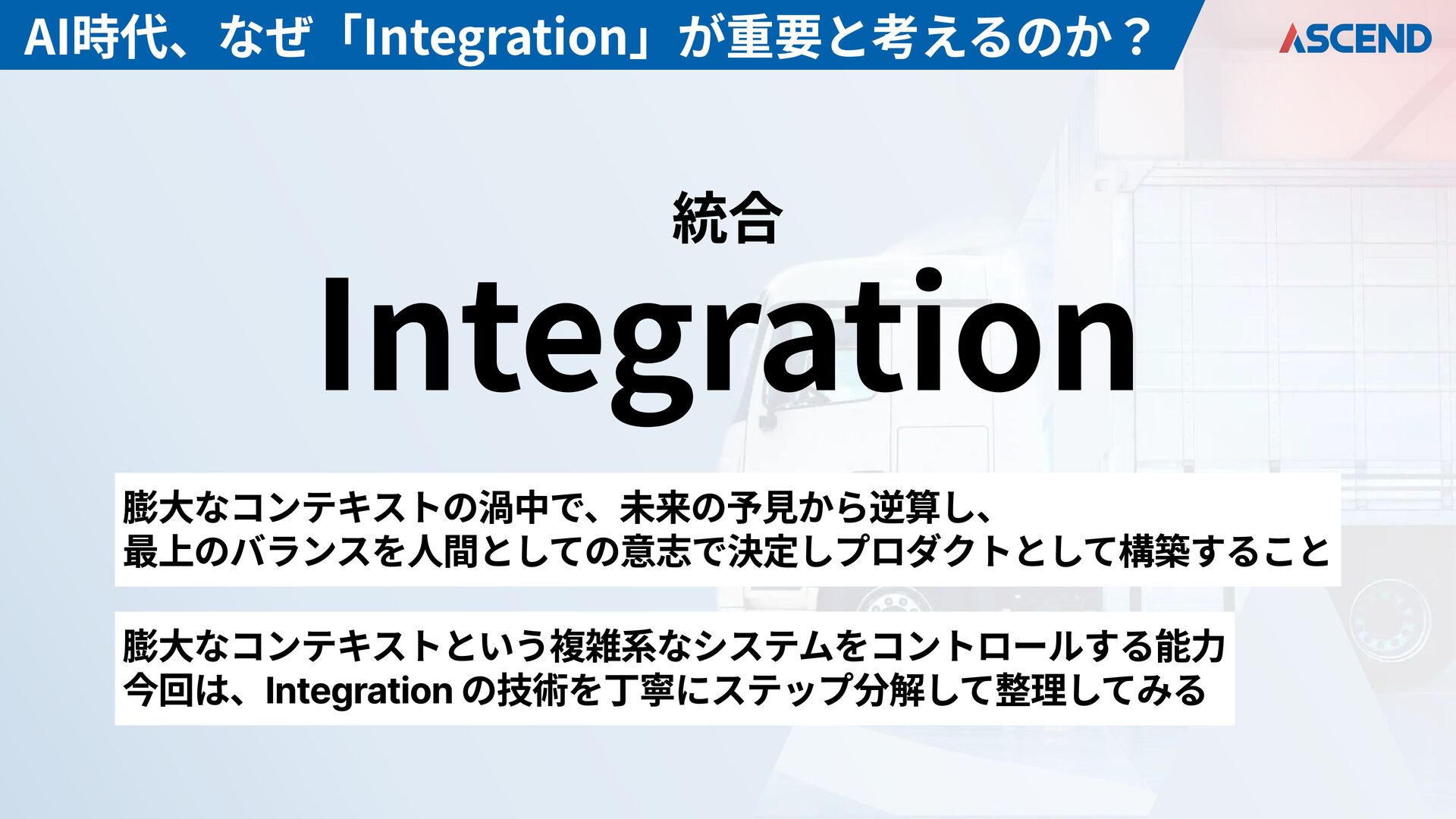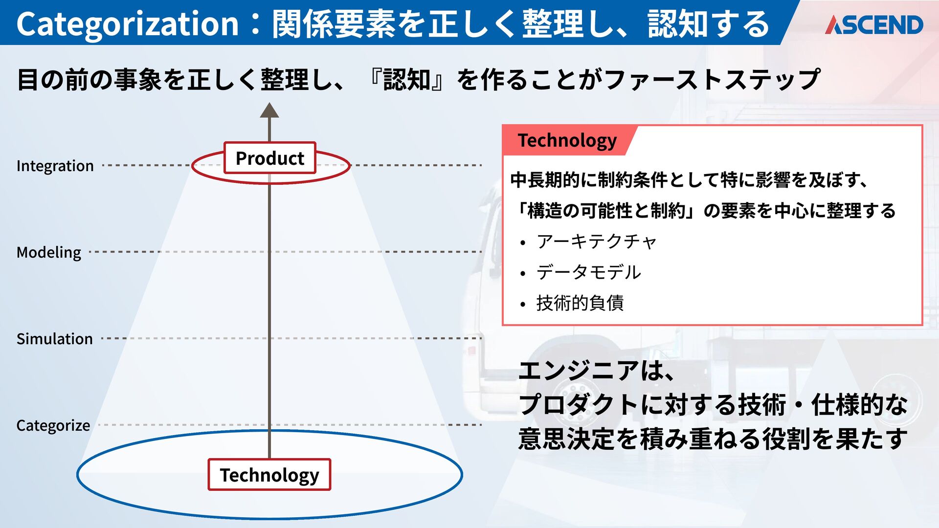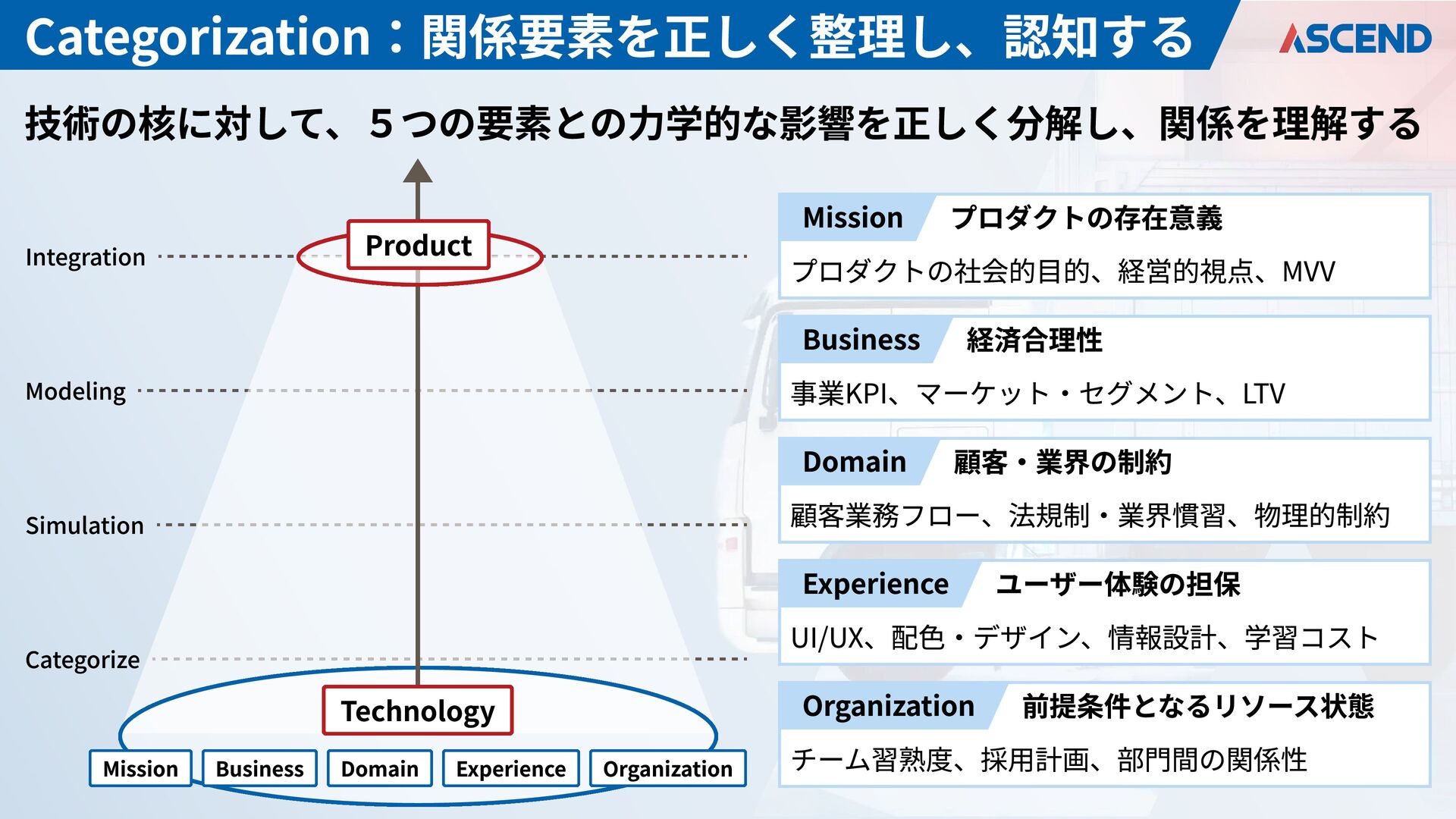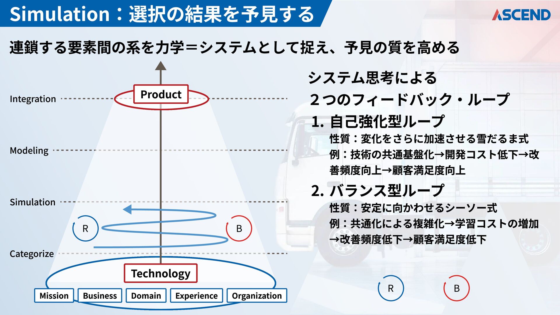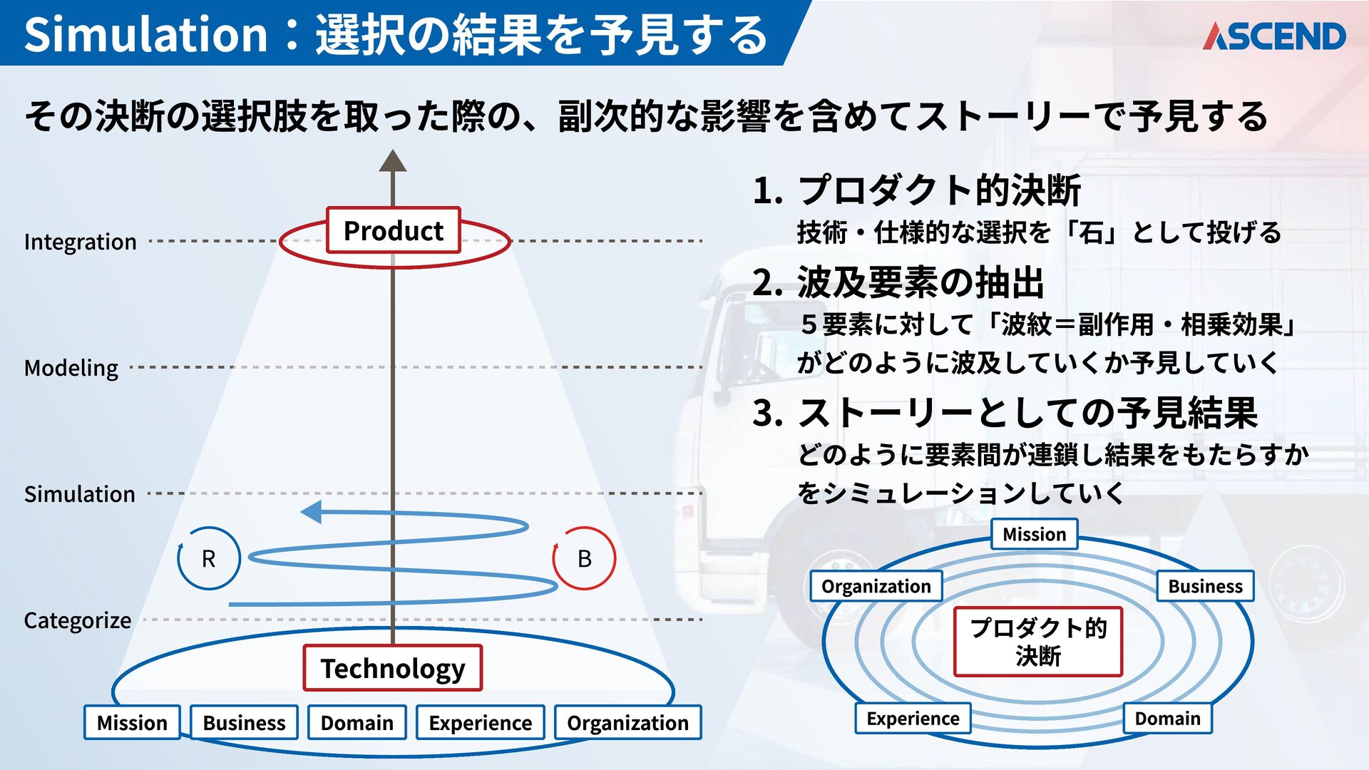 tegr ati on Mode ling Simul ation Cate g o r i ze Te chnol ogy Miss ion Busine ss Do ma in Ex perie nce Organization Mo del Mo del M od el Produ ct ‹‰™ßW àœ¢Â™› Kk W µ2 fi `ã ™qâ Çëh Wfl 統合モデルと は何か? 事象の抽出:予見で終わらせず、 本質的な構造だけを抜き出す作業 事前計算:意思決定の瞬間にゼロから思考す るのではなく、予見結果をキャッシュする なぜ統合モデルが必要か 複雑な力学関係の中でのブレない判断軸。 「一段進んだ理解」を先に済ませることが、 インテグレーションの質を数段上げ