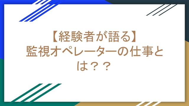 トピック ・今までの経歴 ・監視オペレーターとは?? ・実際にやっていた監視オペレーターの仕事とは? ・監視オペレーター時代の苦悩とは? ・監視オペレーターから抜け出すためには? ・さいごに