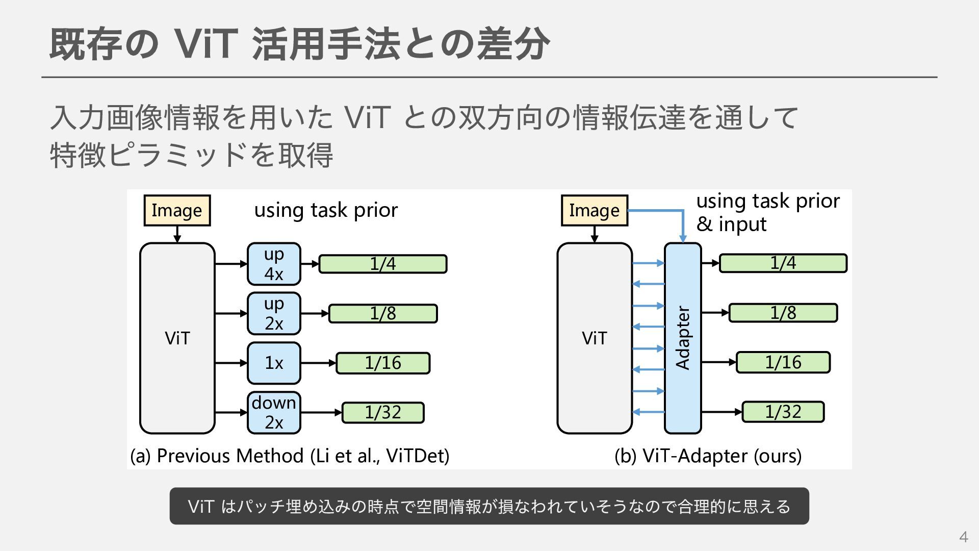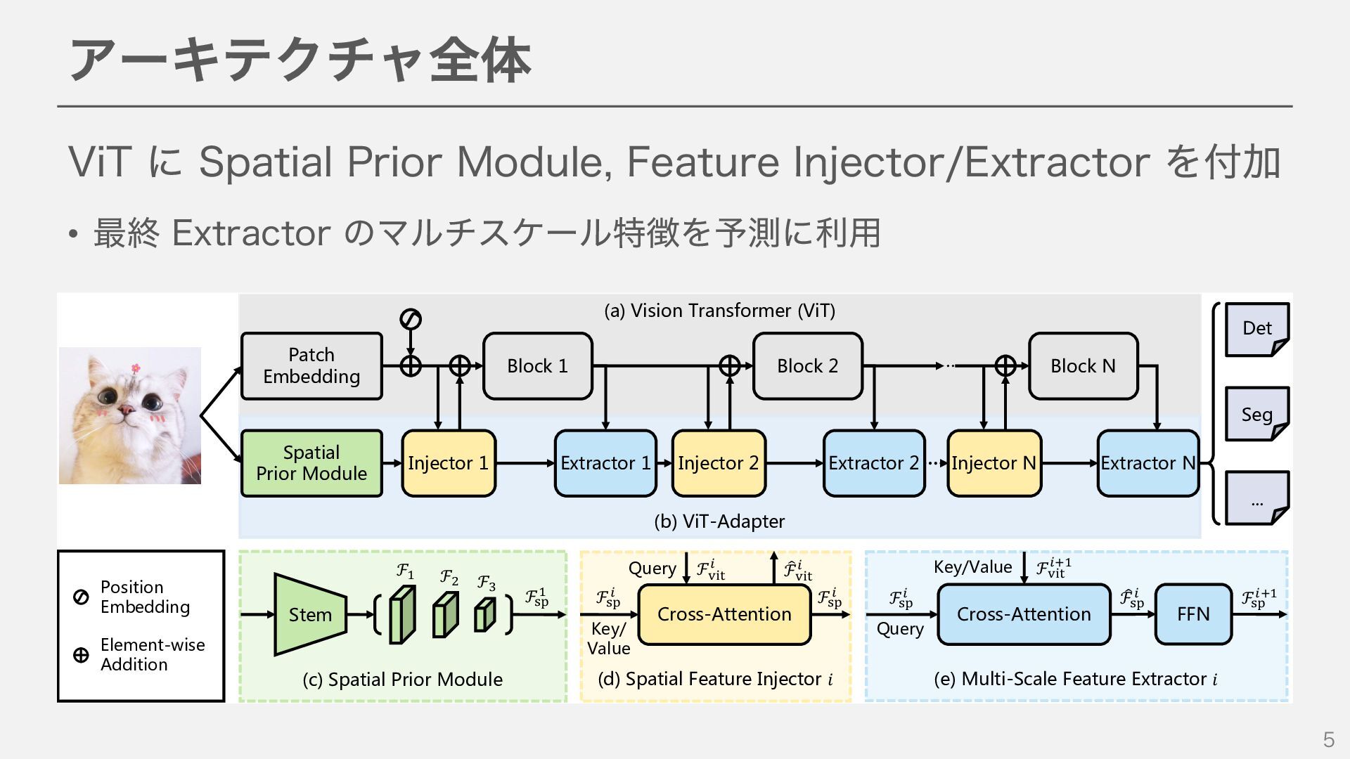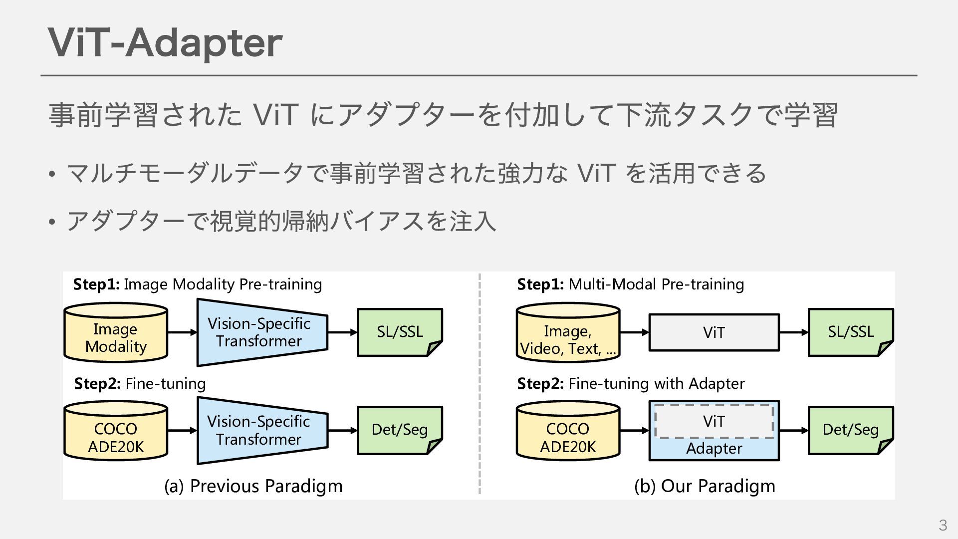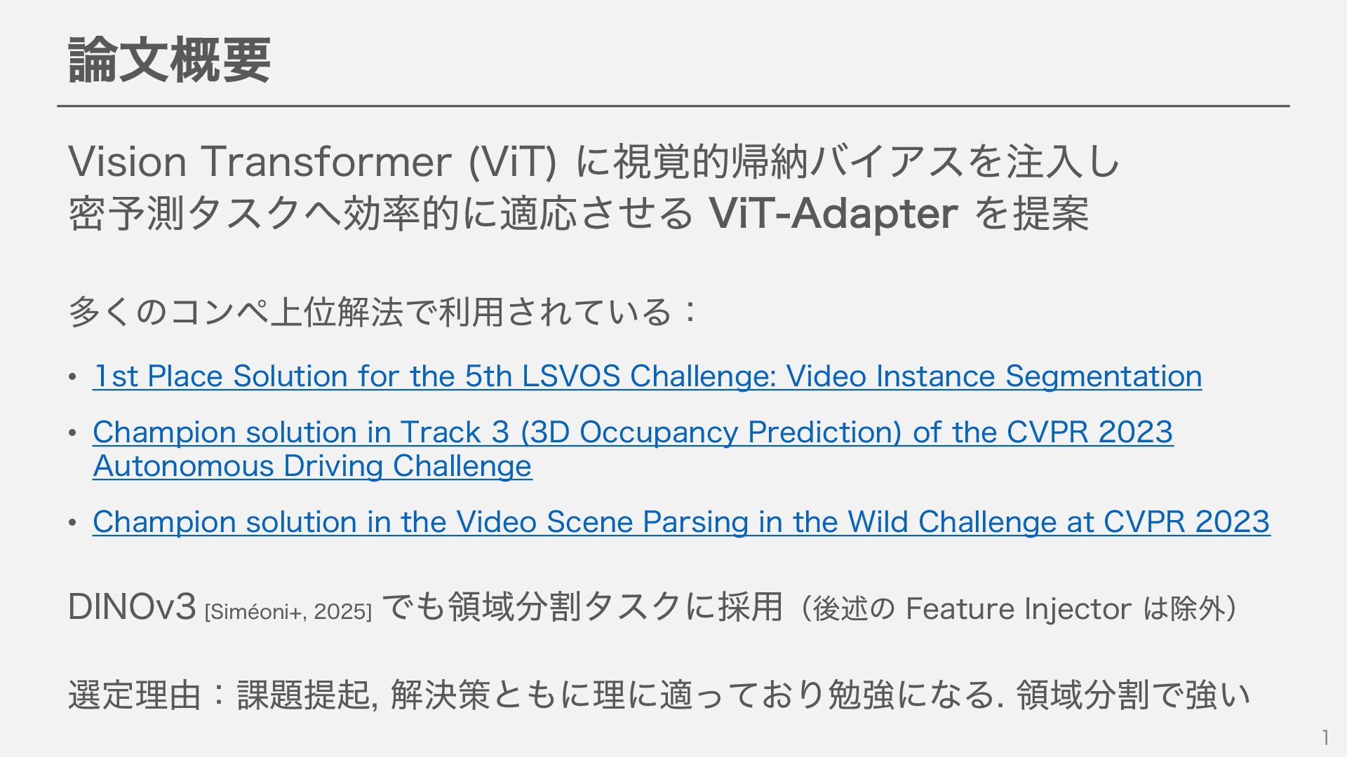 Vision Transformerに視覚的帰納バイアスを注入することで密予測タスクへ効率的に適応させる手法である、ViT-Adapterについての輪講資料です。