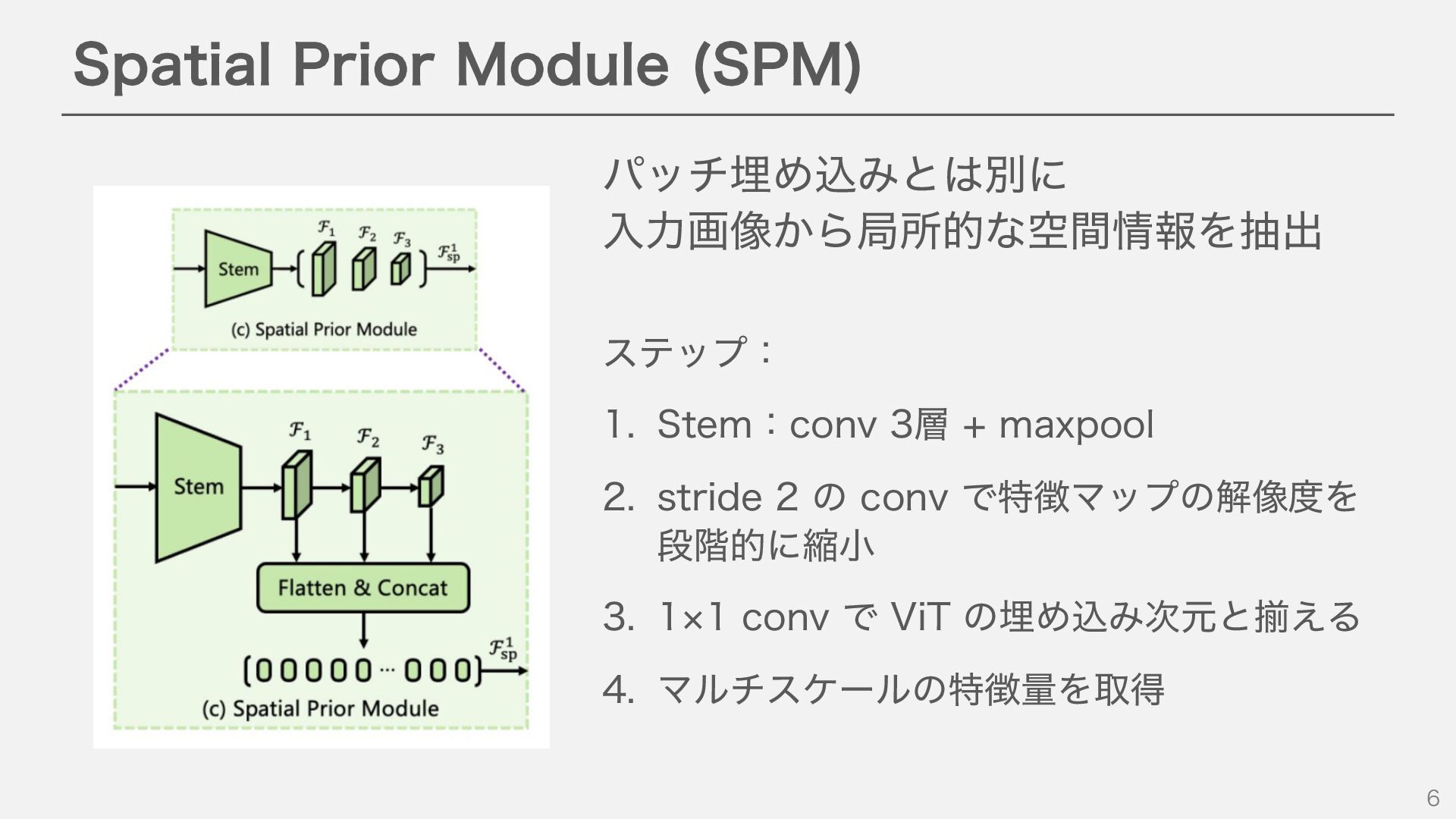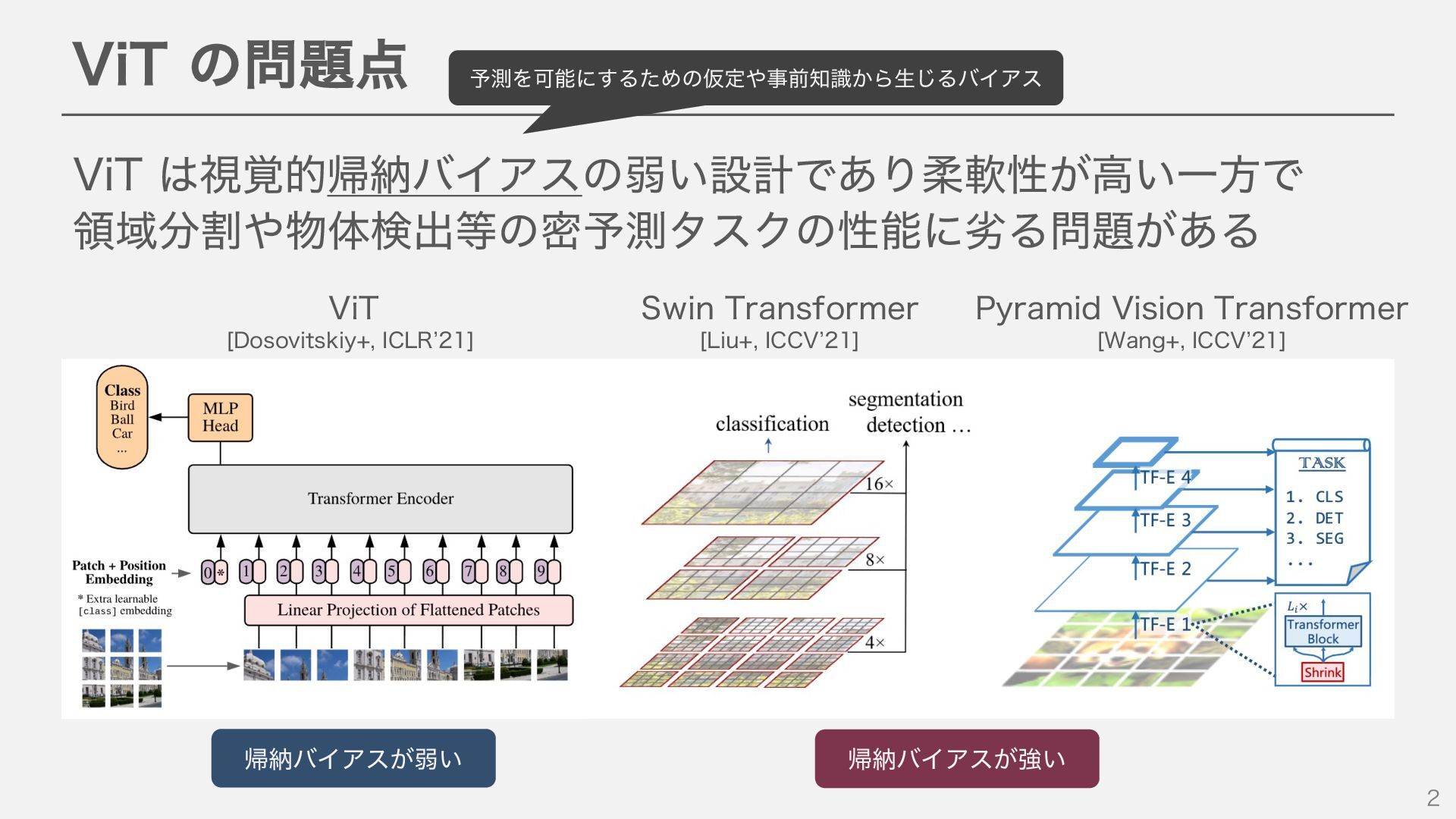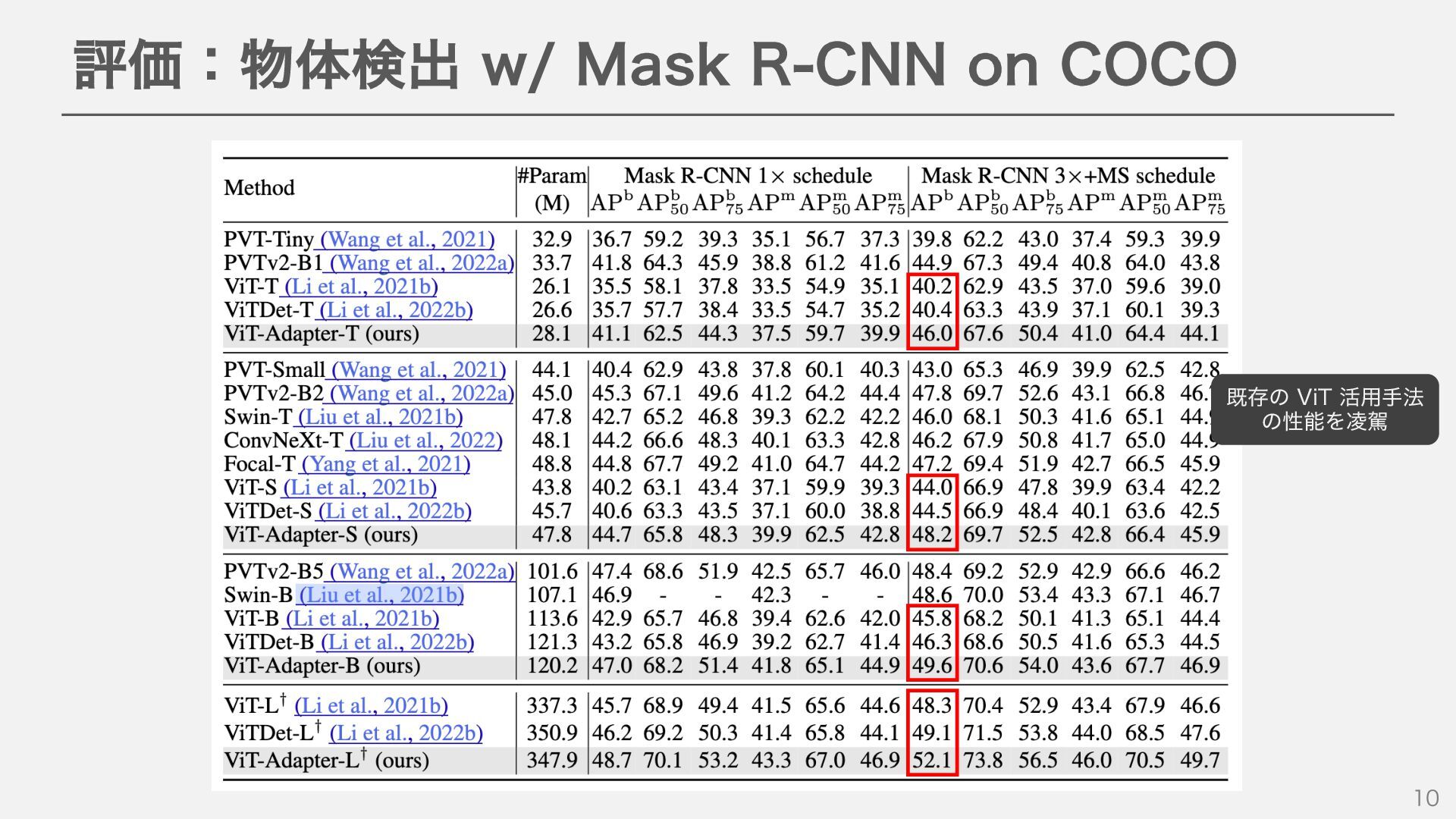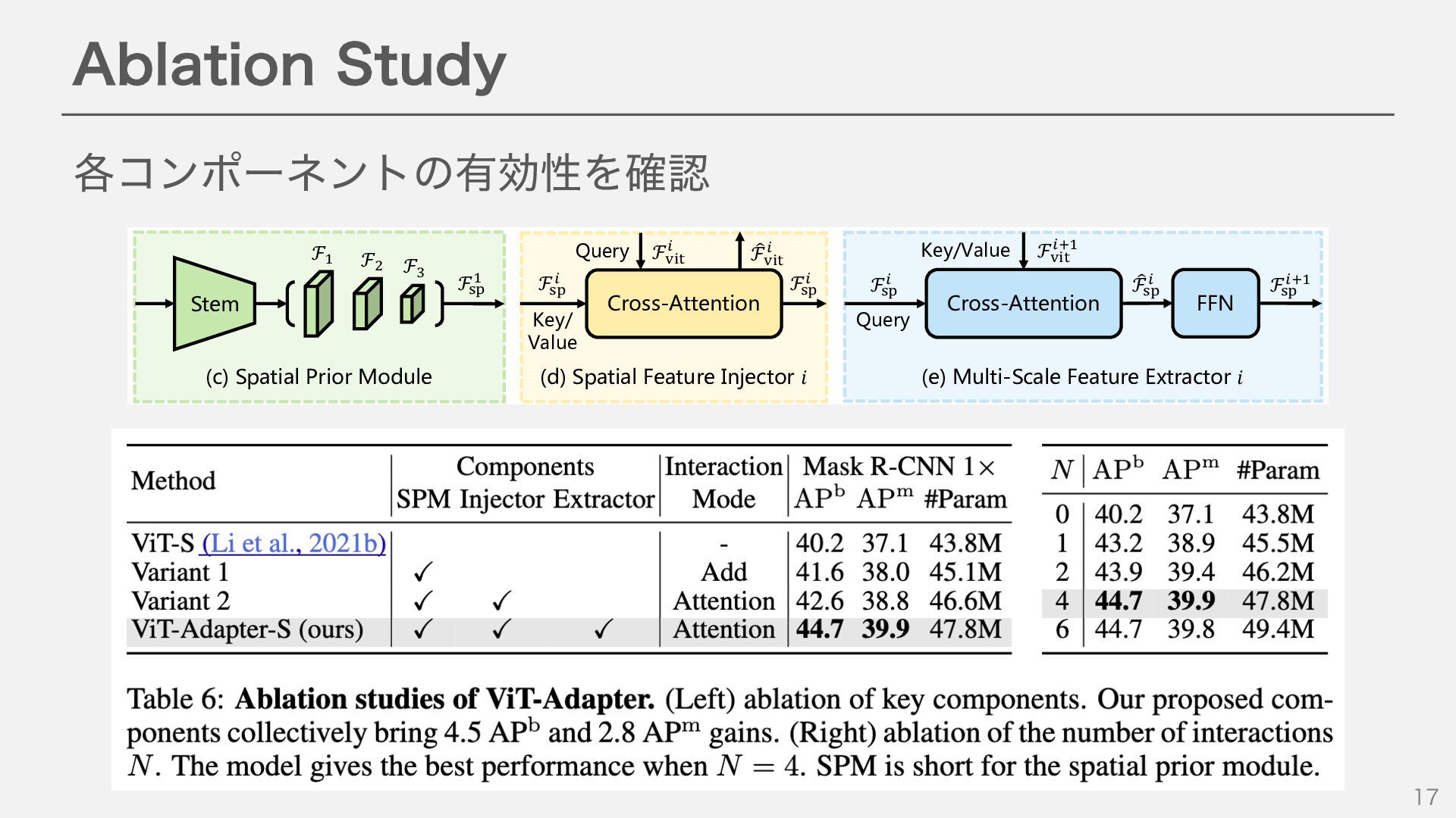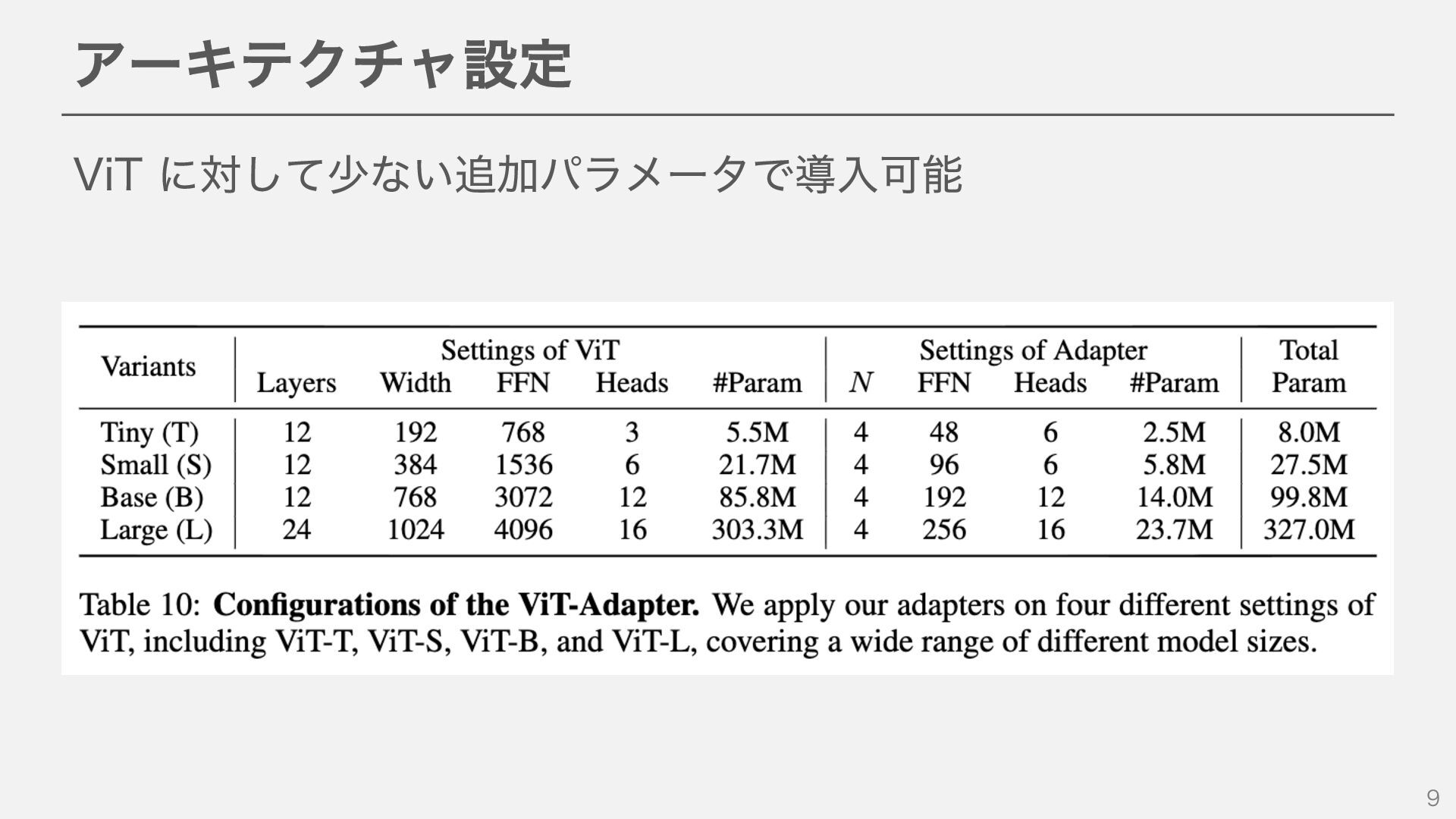 Vision Transformerに視覚的帰納バイアスを注入することで密予測タスクへ効率的に適応させる手法である、ViT-Adapterについての輪講資料です。
