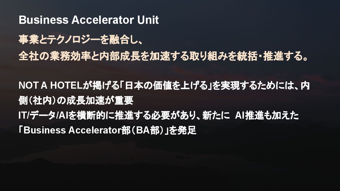 Business Accelerator Unit 事業とテクノロジーを融合し、 全社の業務効率と内部成長を加速する取り組みを統括・推進する。 NOT A HOTELが掲げる「日本の価値を上げる」を実現するためには、内 側(社内)の成長加速が重要 IT/データ/AIを横断的に推進する必要があり、新たに