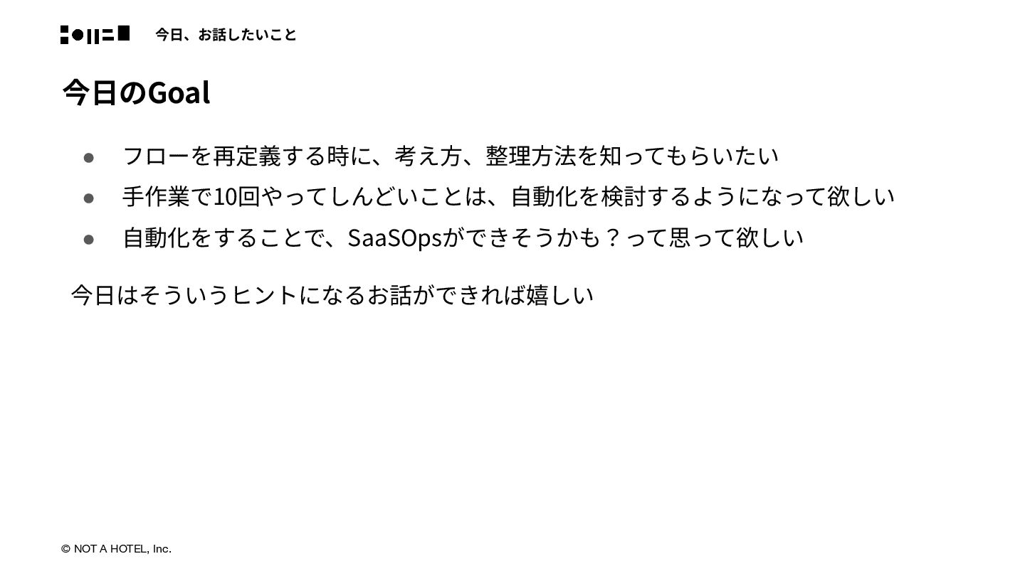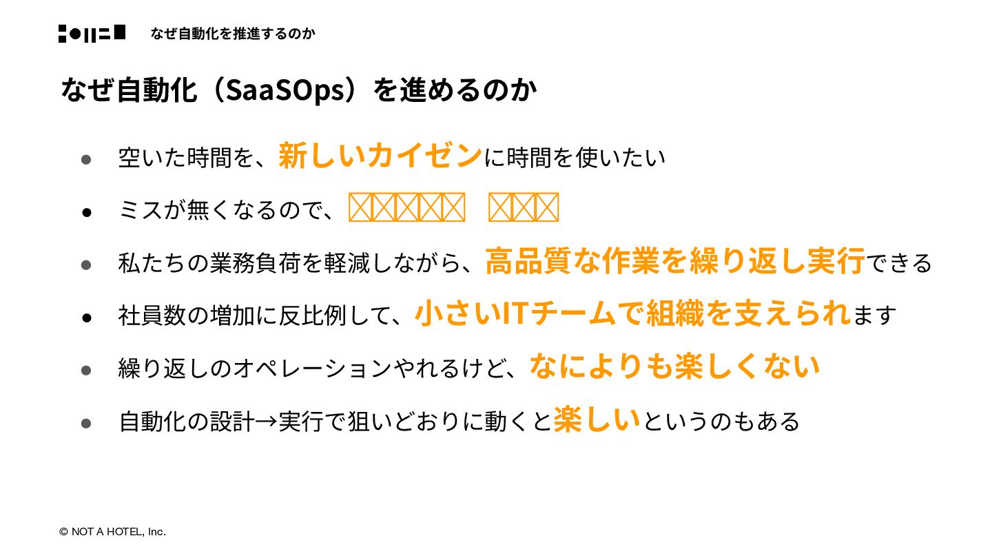© NOT A HOTEL, Inc. なぜ⾃動化を推進するのか なぜ⾃動化(SaaSOps)を進めるのか • 空いた時間を、新しいカイゼンに時間を使いたい •