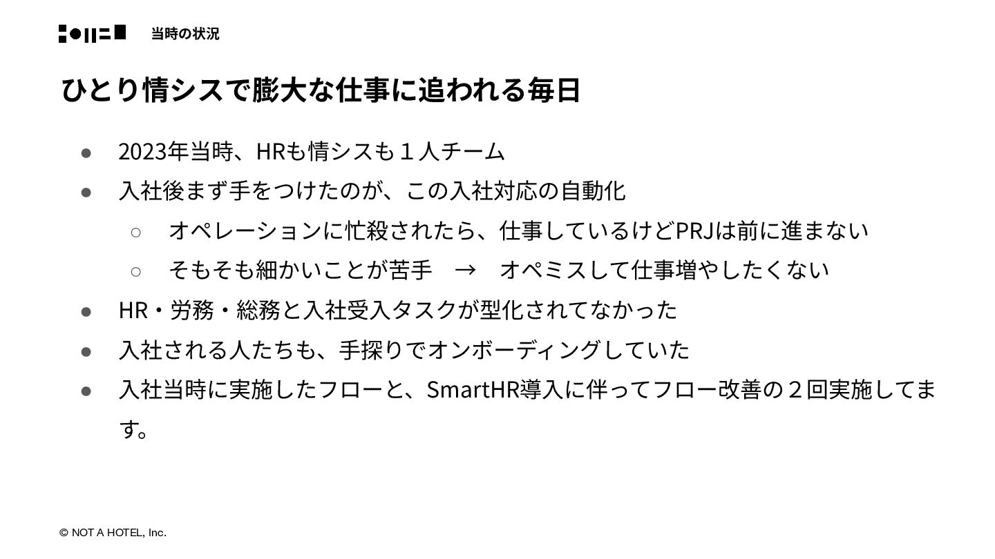 © NOT A HOTEL, Inc. 当時の状況 ひとり情シスで膨⼤な仕事に追われる毎⽇ • 2023年当時、HRも情シスも1⼈チーム •