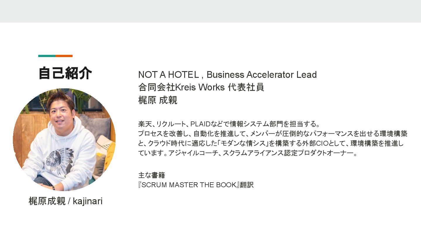 代表社員 梶原 成親 楽天、リクルート、PLAIDなどで情報システム部門を担当する。 プロセスを改善し、自動化を推進して、メンバーが圧倒的なパフォーマンスを出せる環境構築 と、クラウド時代に適応した「モダンな情シス」を構築する外部CIOとして、環境構築を推進し ています。アジャイルコーチ、スクラムアライアンス認定プロダクトオーナー。 主な書籍 『SCRUM MASTER THE BOOK』翻訳 梶原成親 / kajinari