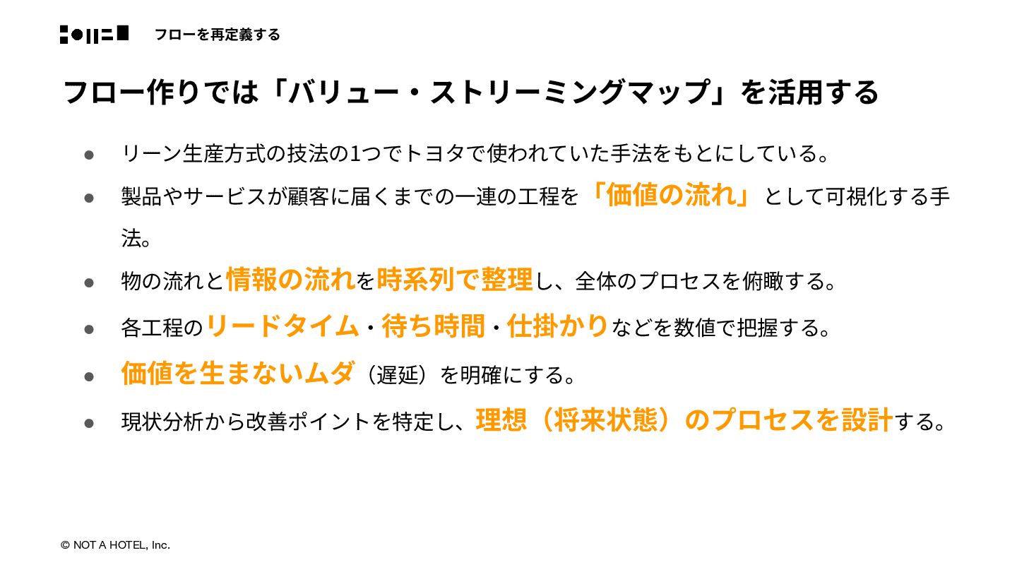 © NOT A HOTEL, Inc. フローを再定義する フロー作りでは「バリュー‧ストリーミングマップ」を活⽤する • リーン⽣産⽅式の技法の1つでトヨタで使われていた⼿法をもとにしている。 •
