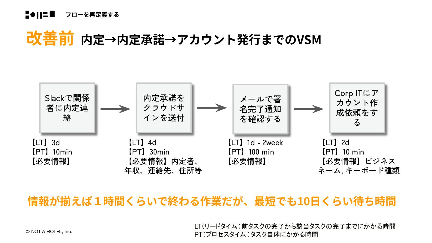 © NOT A HOTEL, Inc. フローを再定義する 改善前 内定→内定承諾→アカウント発⾏までのVSM Slackで関係 者に内定連