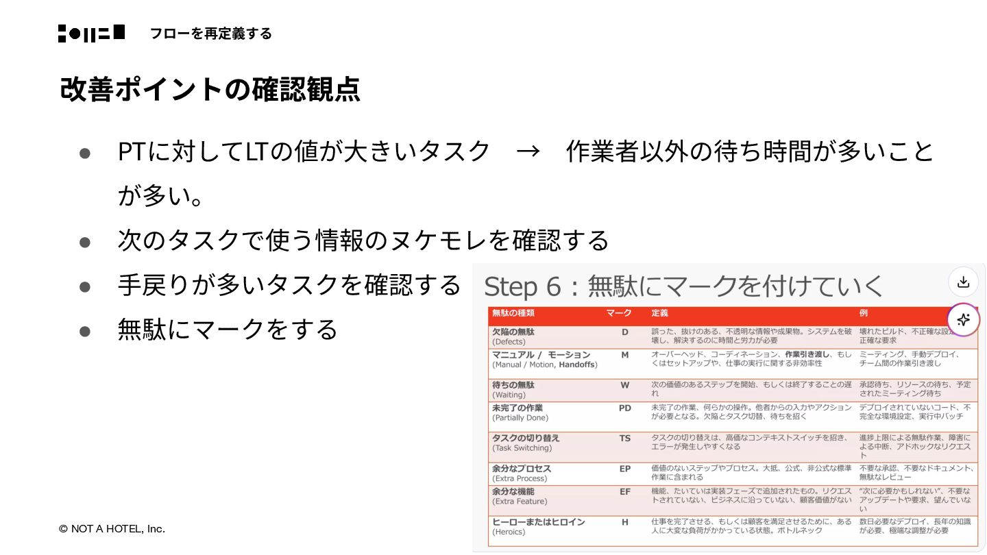 © NOT A HOTEL, Inc. フローを再定義する 改善ポイントの確認観点 • PTに対してLTの値が⼤きいタスク → 作業者以外の待ち時間が多いこと が多い。
