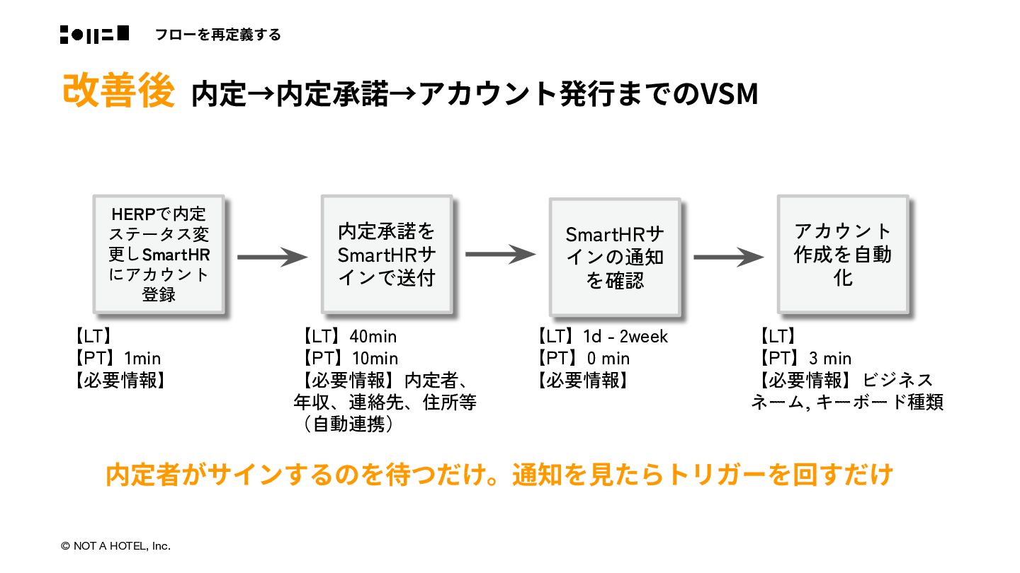 © NOT A HOTEL, Inc. フローを再定義する 改善後 内定→内定承諾→アカウント発⾏までのVSM HERPで内定 ステータス変