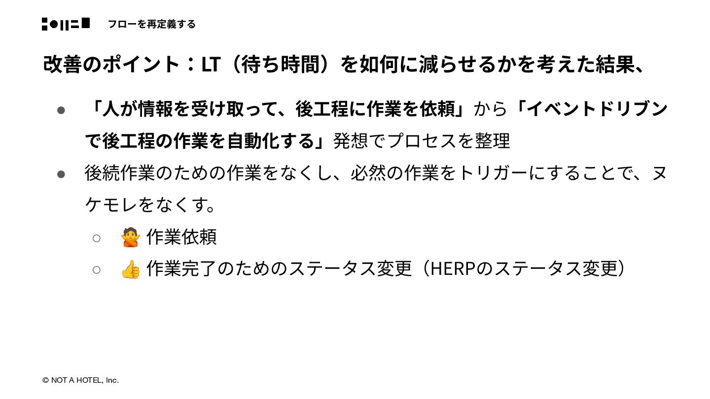 © NOT A HOTEL, Inc. フローを再定義する 改善のポイント:LT(待ち時間)を如何に減らせるかを考えた結果、 • 「⼈が情報を受け取って、後⼯程に作業を依頼」から「イベントドリブン で後⼯程の作業を⾃動化する」発想でプロセスを整理