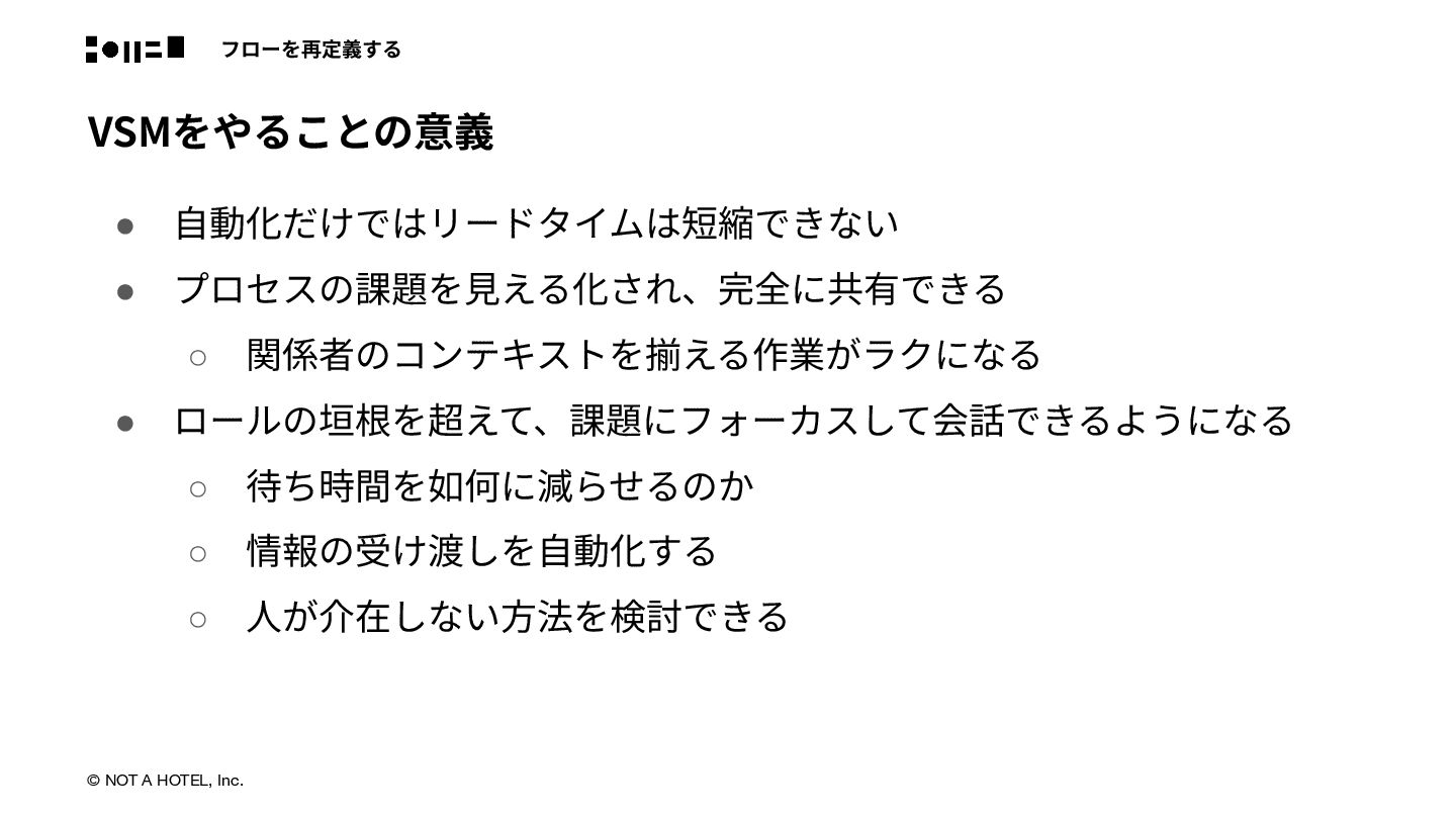 © NOT A HOTEL, Inc. フローを再定義する VSMをやることの意義 • ⾃動化だけではリードタイムは短縮できない •