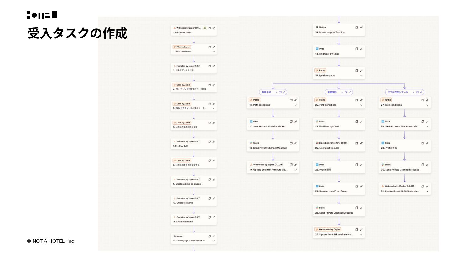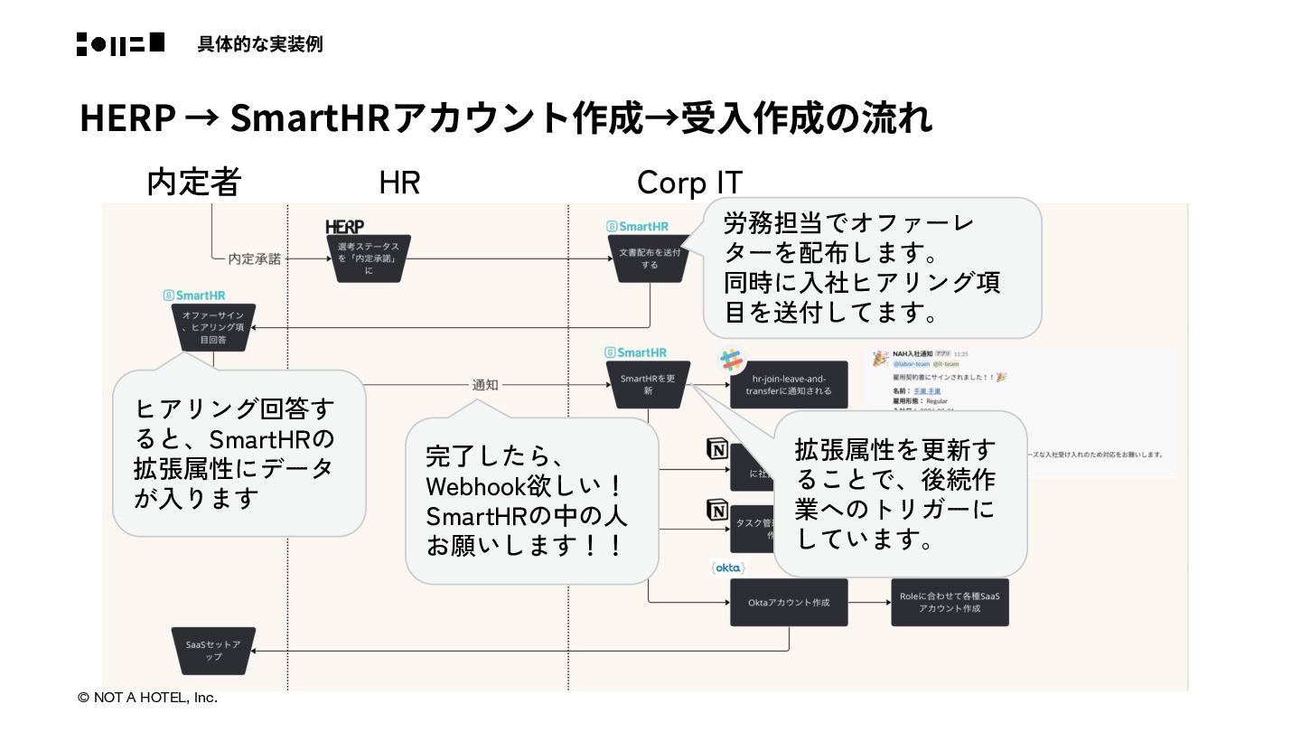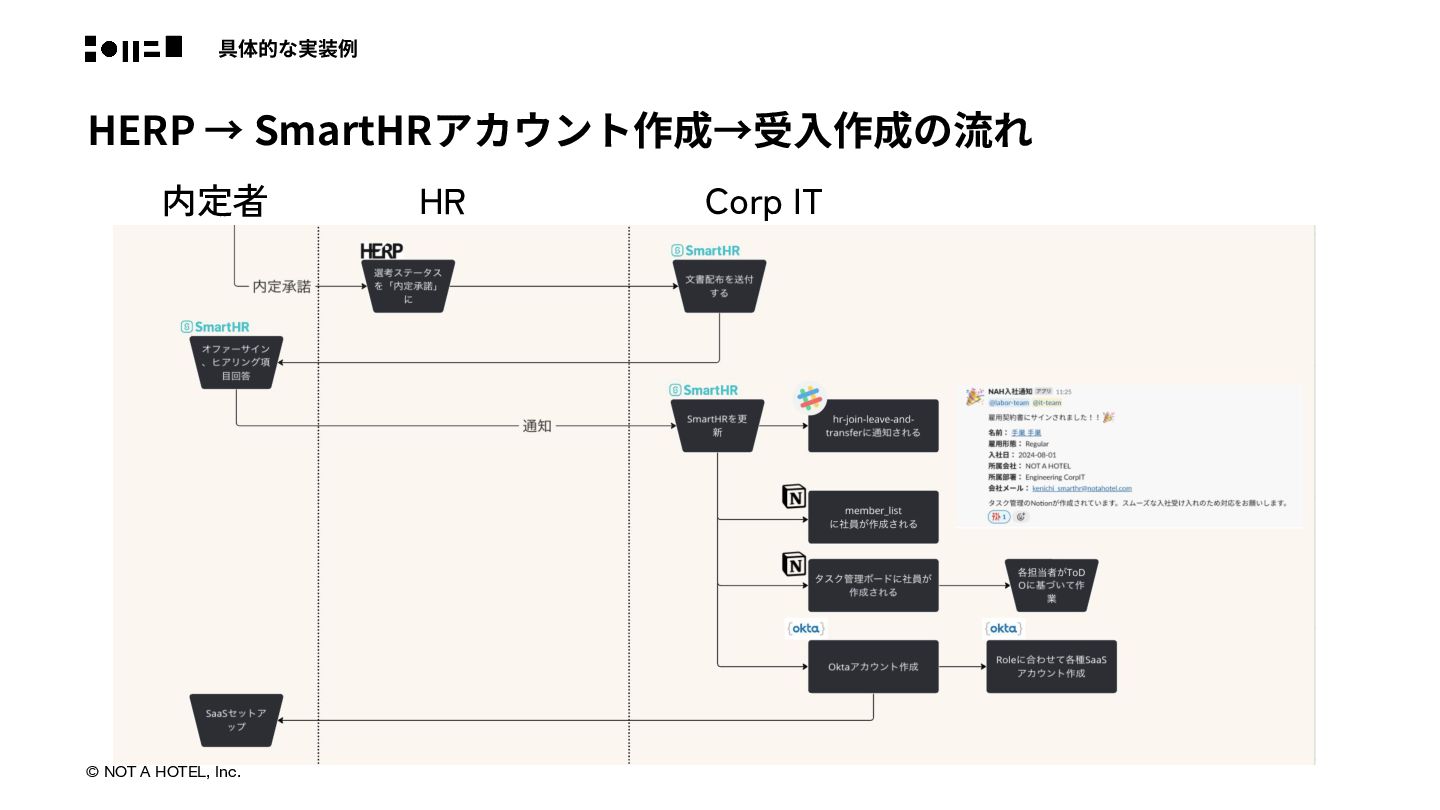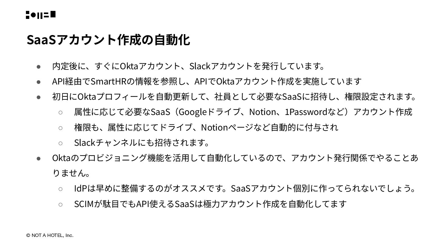 © NOT A HOTEL, Inc. SaaSアカウント作成の⾃動化 • 内定後に、すぐにOktaアカウント、Slackアカウントを発⾏しています。 • API経由でSmartHRの情報を参照し、APIでOktaアカウント作成を実施しています