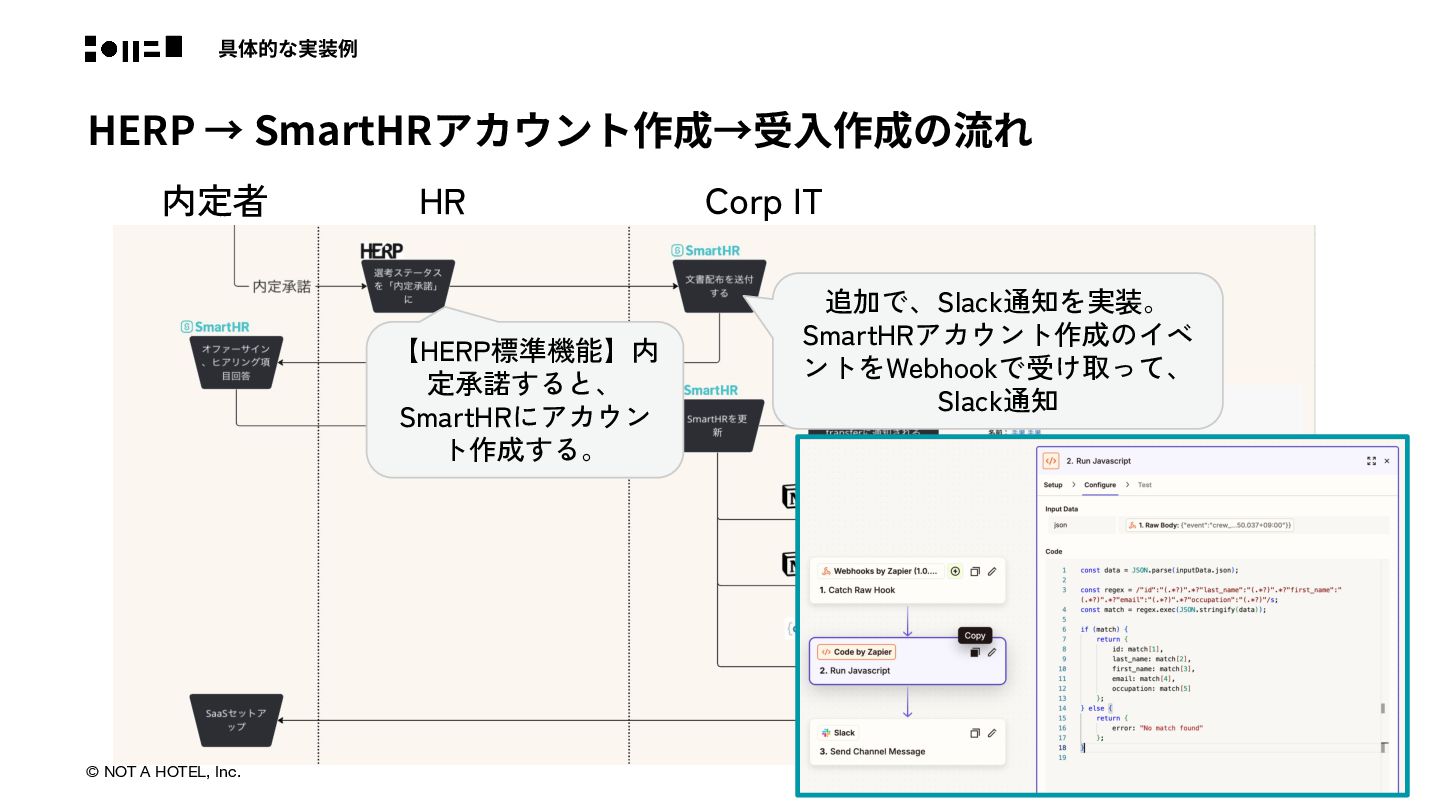 © NOT A HOTEL, Inc. 具体的な実装例 HERP → SmartHRアカウント作成→受⼊作成の流れ 内定者