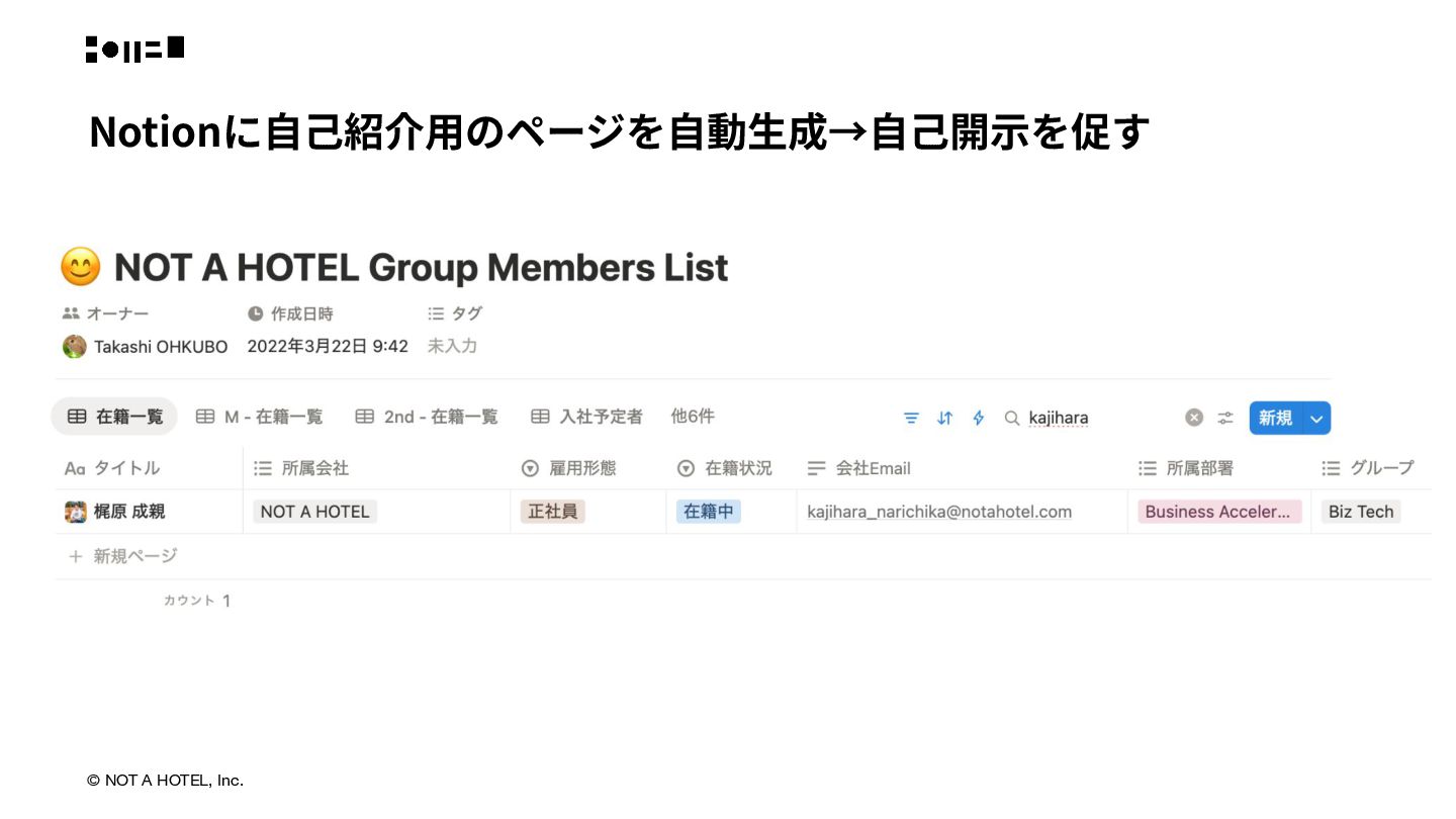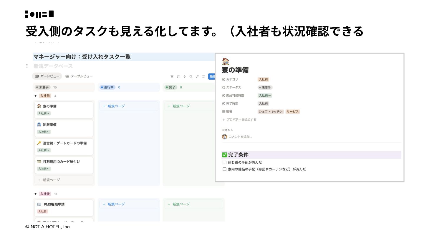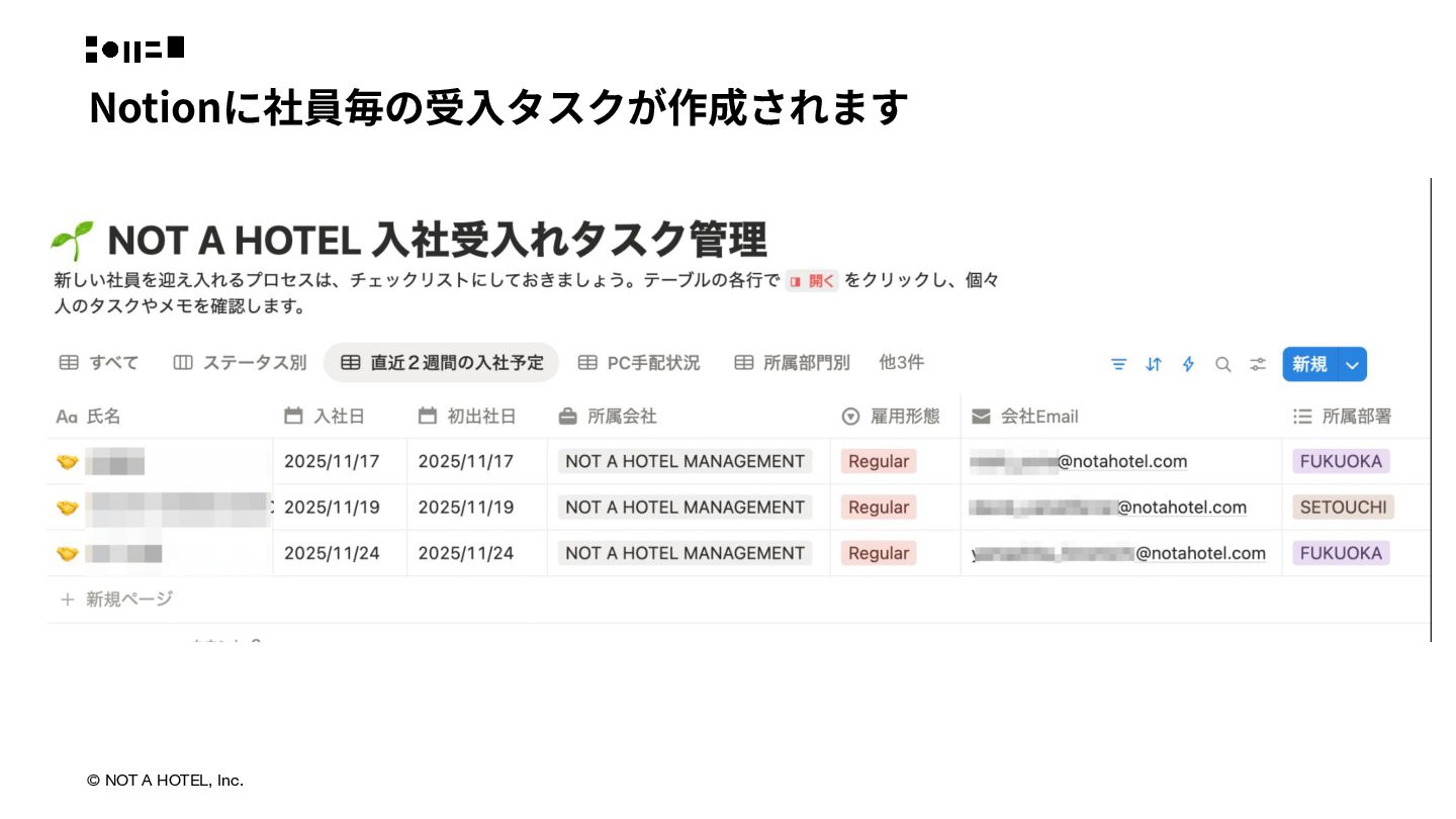 © NOT A HOTEL, Inc. Notionに社員毎の受⼊タスクが作成されます
