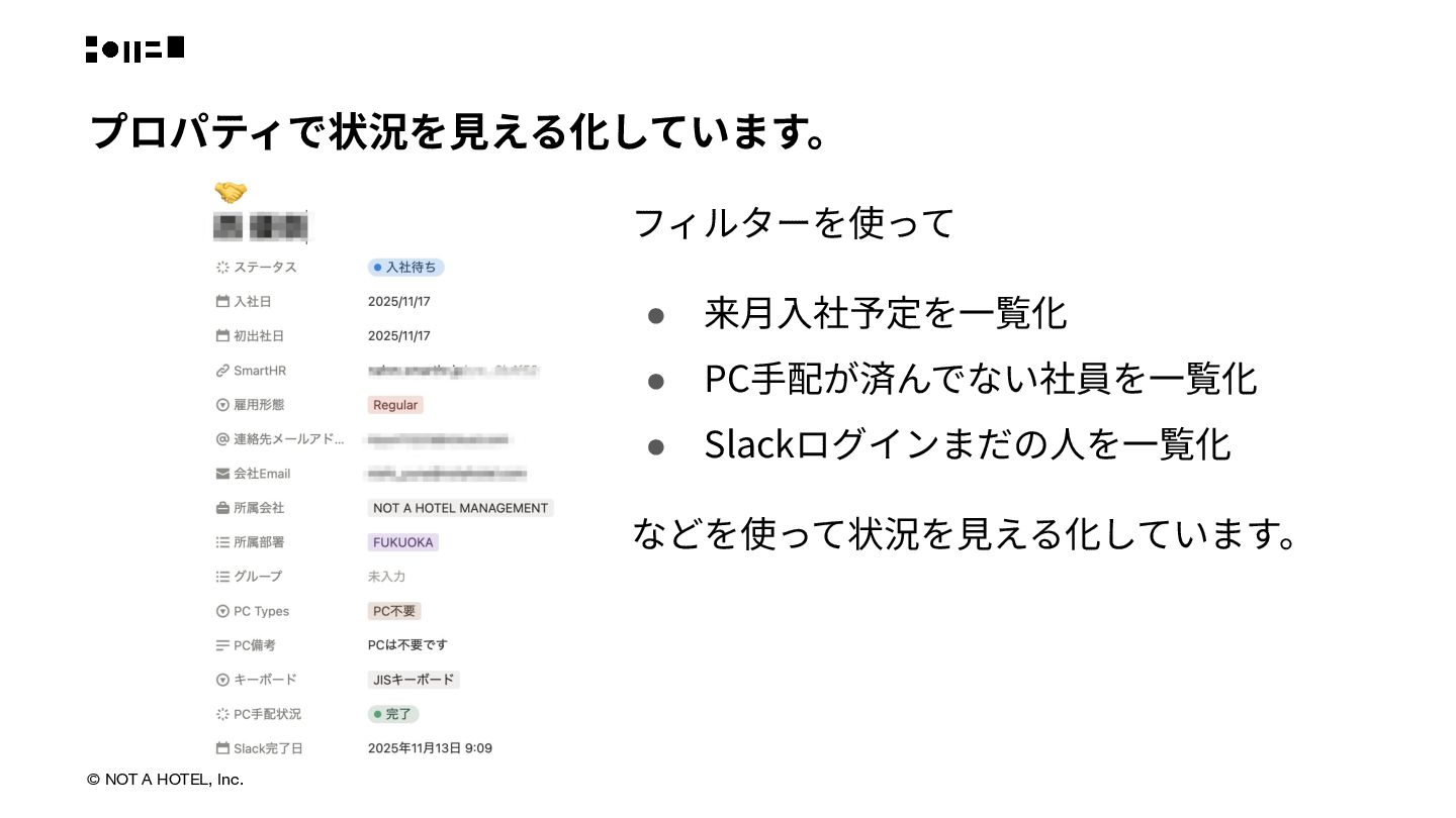 © NOT A HOTEL, Inc. プロパティで状況を⾒える化しています。 フィルターを使って • 来⽉⼊社予定を⼀覧化 •