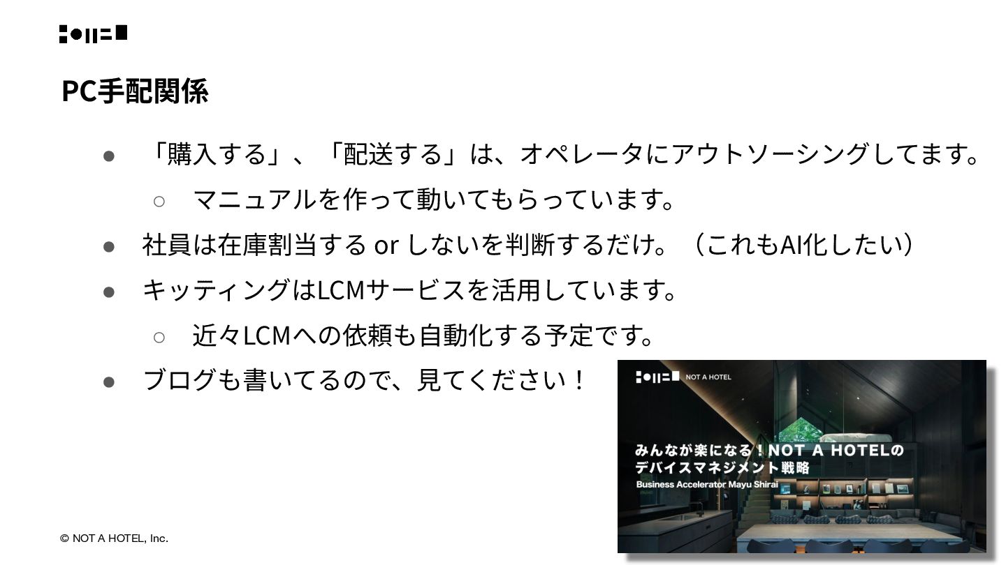 • 社員は在庫割当する or しないを判断するだけ。(これもAI化したい) • キッティングはLCMサービスを活⽤しています。 ◦ 近々LCMへの依頼も⾃動化する予定です。 • ブログも書いてるので、⾒てください!