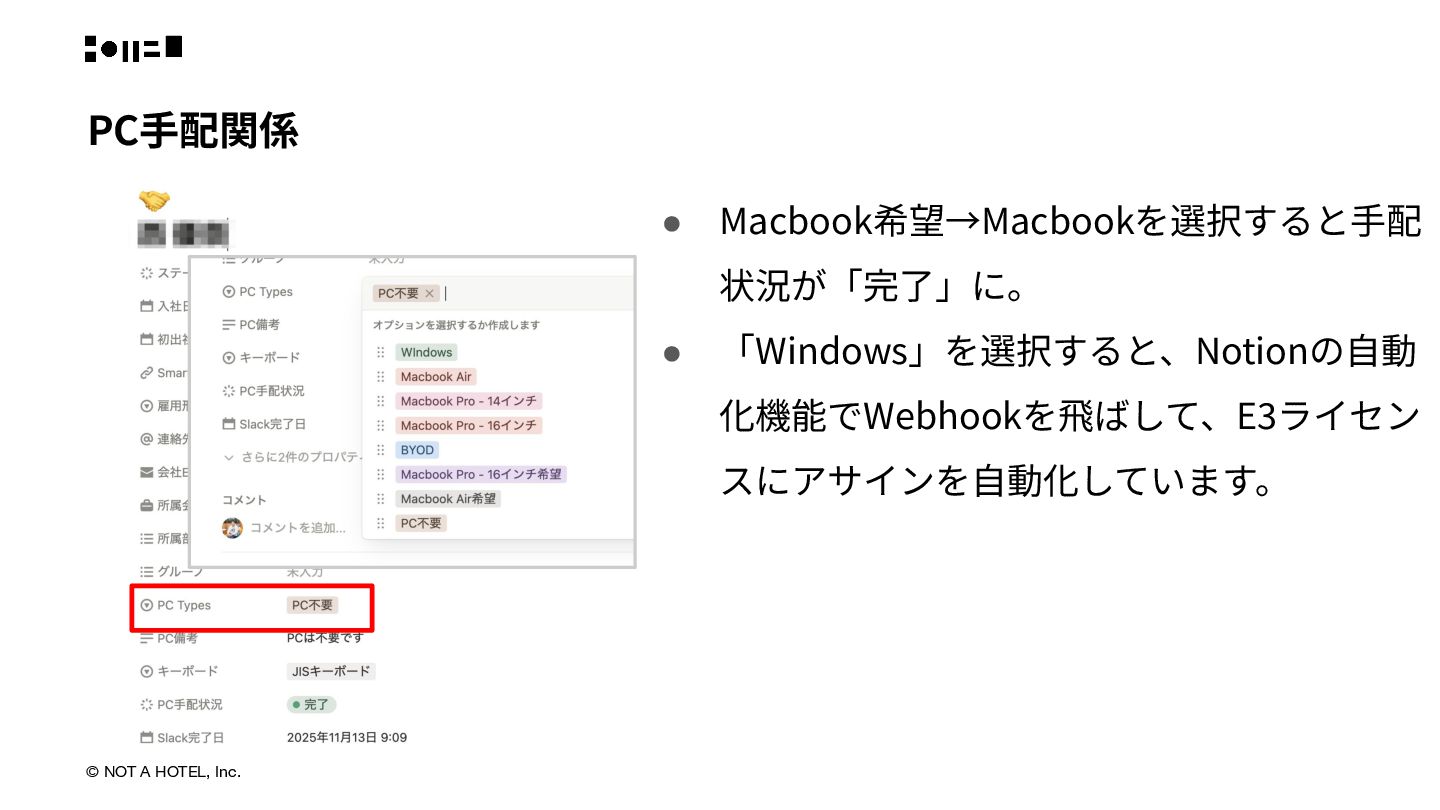 © NOT A HOTEL, Inc. PC⼿配関係 • Macbook希望→Macbookを選択すると⼿配 状況が「完了」に。 •