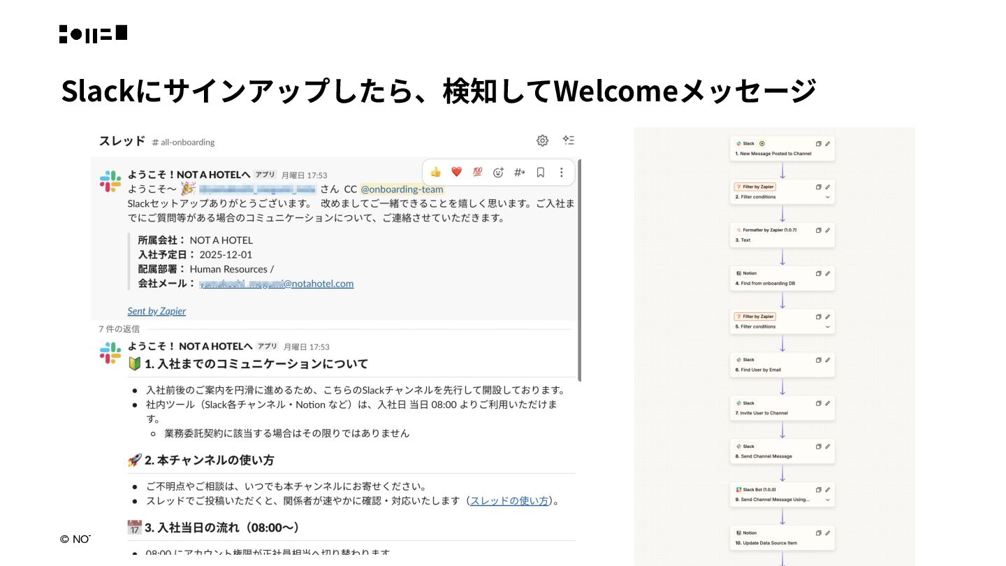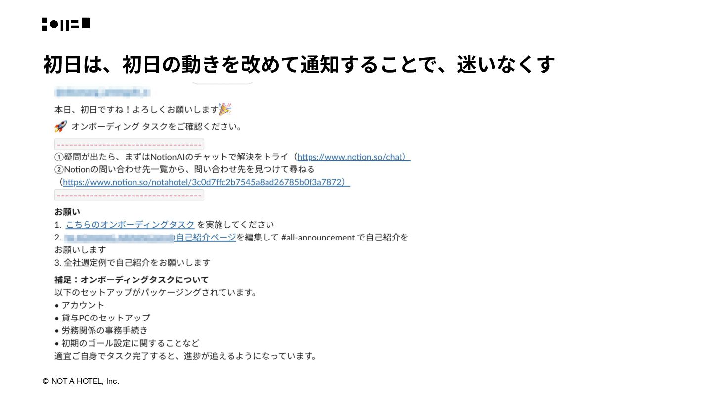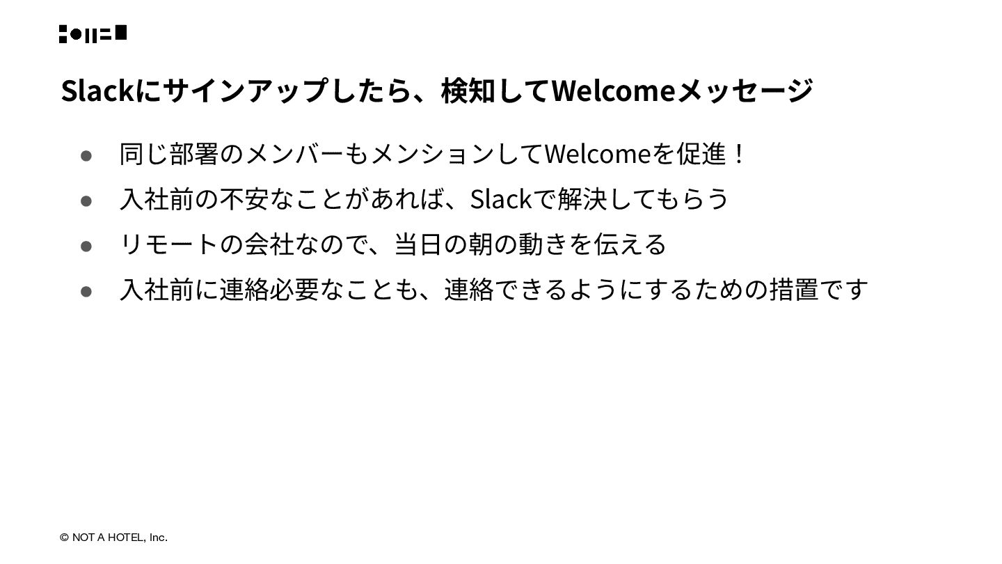 © NOT A HOTEL, Inc. Slackにサインアップしたら、検知してWelcomeメッセージ • 同じ部署のメンバーもメンションしてWelcomeを促進! • ⼊社前の不安なことがあれば、Slackで解決してもらう