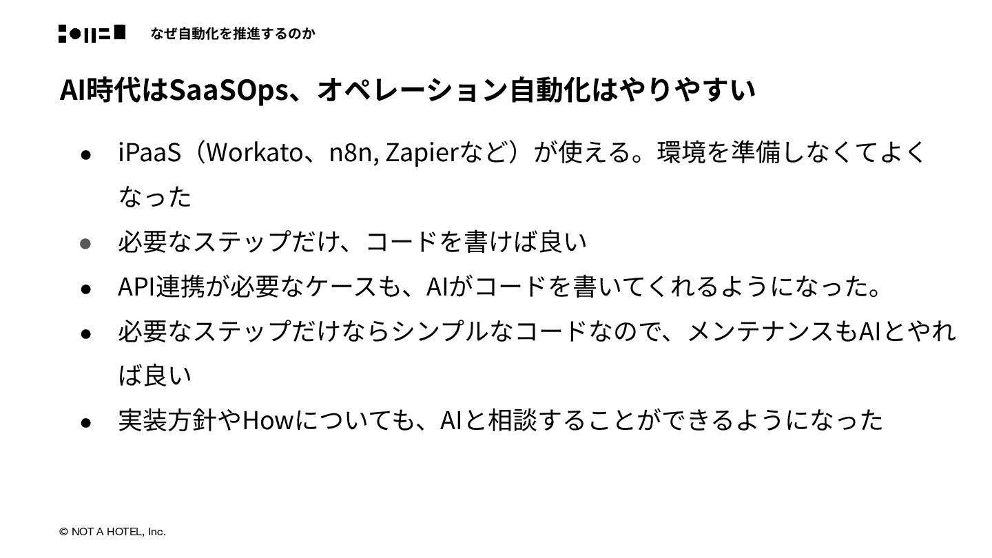 © NOT A HOTEL, Inc. なぜ⾃動化を推進するのか AI時代はSaaSOps、オペレーション⾃動化はやりやすい • iPaaS(Workato、n8n, Zapierなど)が使える。環境を準備しなくてよく