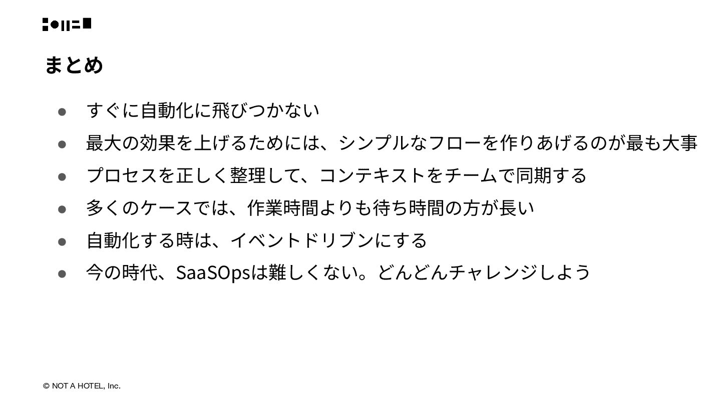 © NOT A HOTEL, Inc. まとめ • すぐに⾃動化に⾶びつかない • 最⼤の効果を上げるためには、シンプルなフローを作りあげるのが最も⼤事