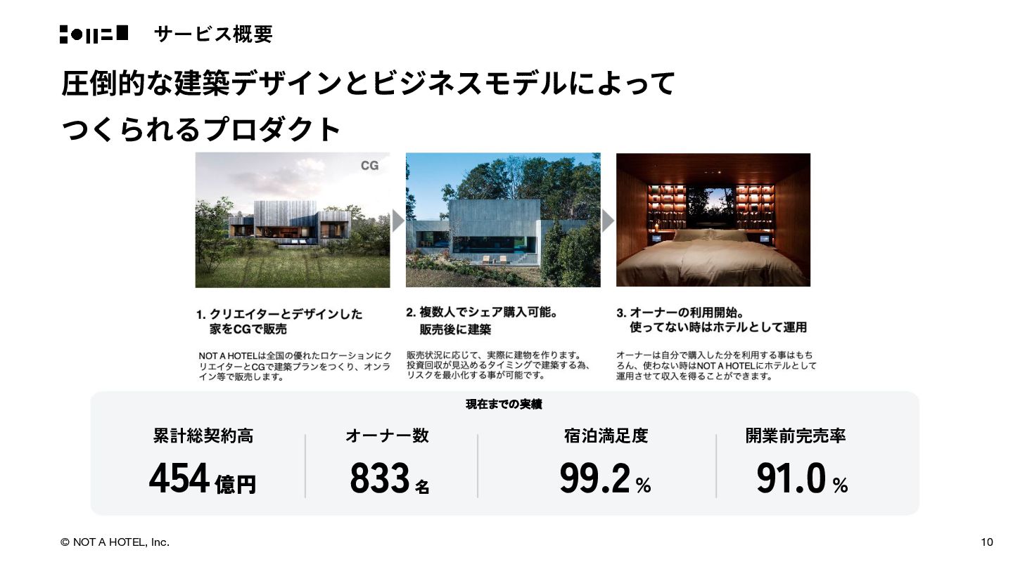 454億円 累計総契約高 オーナー数 宿泊満足度 開業前完売率 現在までの実績 圧倒的な建築デザインとビジネスモデルによって つくられるプロダクト
