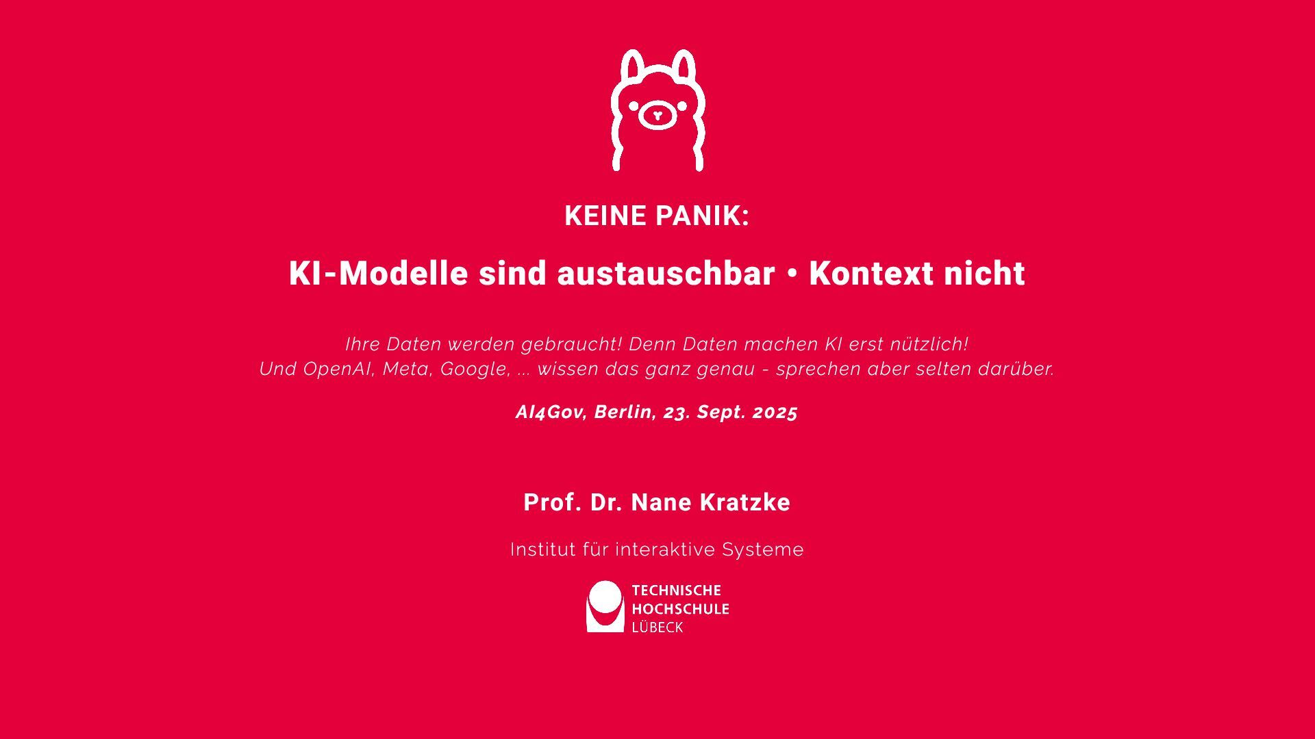 werden gebraucht! Denn Daten machen KI erst nützlich! Und OpenAI, Meta, Google, ... wissen das ganz genau - sprechen aber selten darüber. AI4Gov, Berlin, 23. Sept. 2025 Prof. Dr. Nane Kratzke Institut für interaktive Systeme
