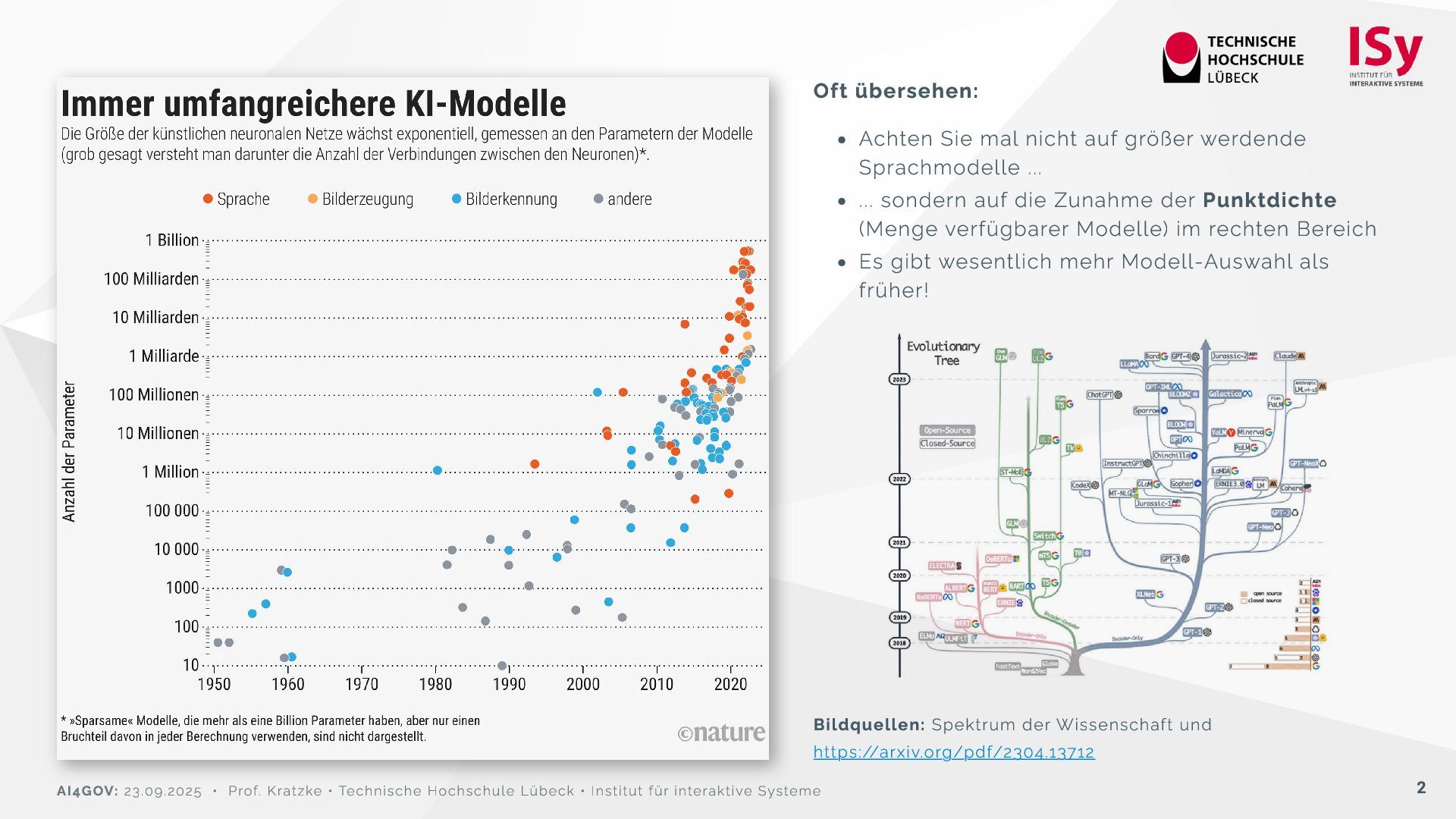 ... ... sondern auf die Zunahme der Punktdichte (Menge verfügbarer Modelle) im rechten Bereich Es gibt wesentlich mehr Modell-Auswahl als früher! Bildquellen: Spektrum der Wissenschaft und https://arxiv.org/pdf/2304.13712 AI4GOV: 23.09.2025 • Prof. Kratzke • Technische Hochschule Lübeck • Institut für interaktive Systeme 2