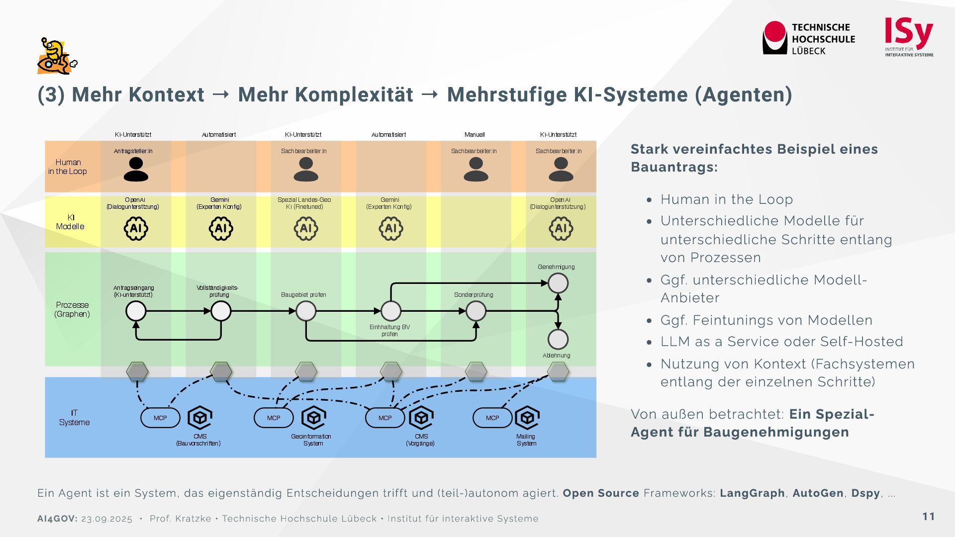 Stark vereinfachtes Beispiel eines Bauantrags: Human in the Loop Unterschiedliche Modelle für unterschiedliche Schritte entlang von Prozessen Ggf. unterschiedliche Modell- Anbieter Ggf. Feintunings von Modellen LLM as a Service oder Self-Hosted Nutzung von Kontext (Fachsystemen entlang der einzelnen Schritte) Von außen betrachtet: Ein Spezial- Agent für Baugenehmigungen Ein Agent ist ein System, das eigenständig Entscheidungen trifft und (teil-)autonom agiert. Open Source Frameworks: LangGraph, AutoGen, Dspy, ... IT Systeme Prozesse (Graphen) KI Modelle Human in the Loop Automatisiert KI-Unterstützt Geoinformation System CMS (Bauvorschriften) Mailing System MCP MCP MCP OpenAI (Dialoguntersttzung) Antragseingang (KI-unterstützt) Vollständigkeits- prüfung Antragsteller:in Baugebiet prüfen Spezial Landes-Geo KI (Finetuned) Sachbearbeiter:in Einhhaltung BV prüfen Gemini (Experten Konfig) OpenAI (Dialogunterstützung) Sonderprüfung Gemini (Experten Konfig) Sachbearbeiter:in Genehmigung Ablehnung Sachbearbeiter:in CMS (Vorgänge) MCP Automatisiert KI-Unterstützt KI-Unterstützt Manuell AI4GOV: 23.09.2025 • Prof. Kratzke • Technische Hochschule Lübeck • Institut für interaktive Systeme 11