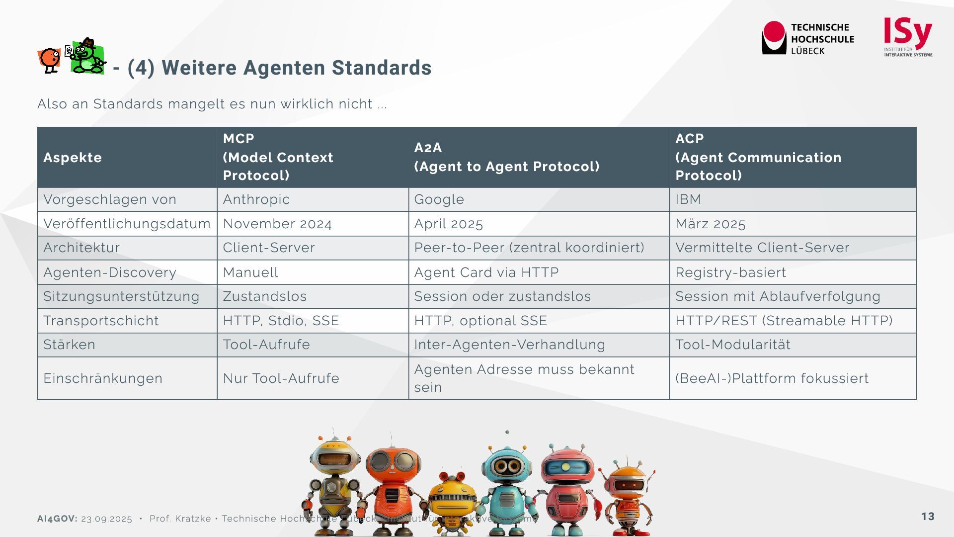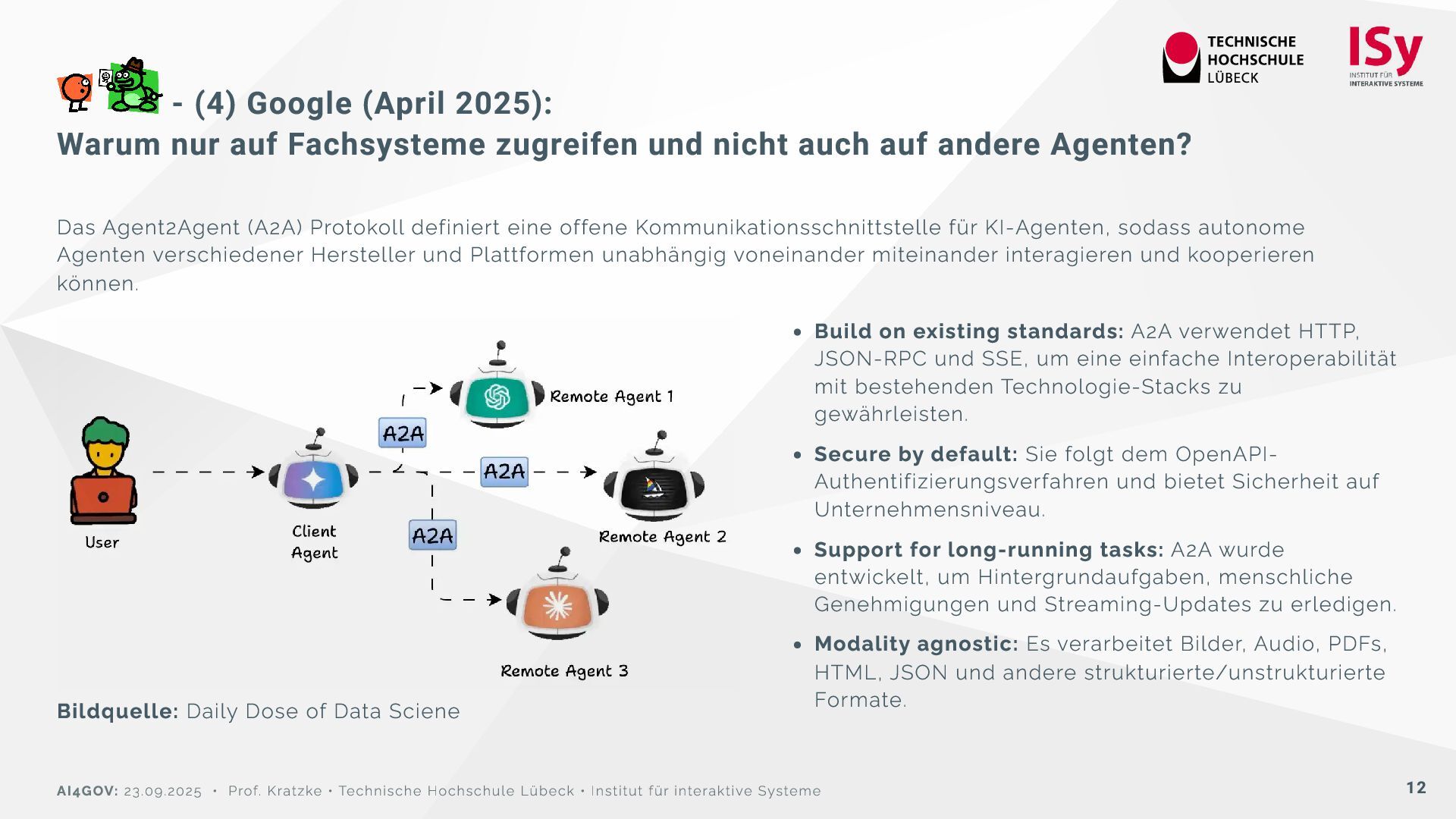 und nicht auch auf andere Agenten? Das Agent2Agent (A2A) Protokoll definiert eine offene Kommunikationsschnittstelle für KI-Agenten, sodass autonome Agenten verschiedener Hersteller und Plattformen unabhängig voneinander miteinander interagieren und kooperieren können. Bildquelle: Daily Dose of Data Sciene Build on existing standards: A2A verwendet HTTP, JSON-RPC und SSE, um eine einfache Interoperabilität mit bestehenden Technologie-Stacks zu gewährleisten. Secure by default: Sie folgt dem OpenAPI- Authentifizierungsverfahren und bietet Sicherheit auf Unternehmensniveau. Support for long-running tasks: A2A wurde entwickelt, um Hintergrundaufgaben, menschliche Genehmigungen und Streaming-Updates zu erledigen. Modality agnostic: Es verarbeitet Bilder, Audio, PDFs, HTML, JSON und andere strukturierte/unstrukturierte Formate. AI4GOV: 23.09.2025 • Prof. Kratzke • Technische Hochschule Lübeck • Institut für interaktive Systeme 12