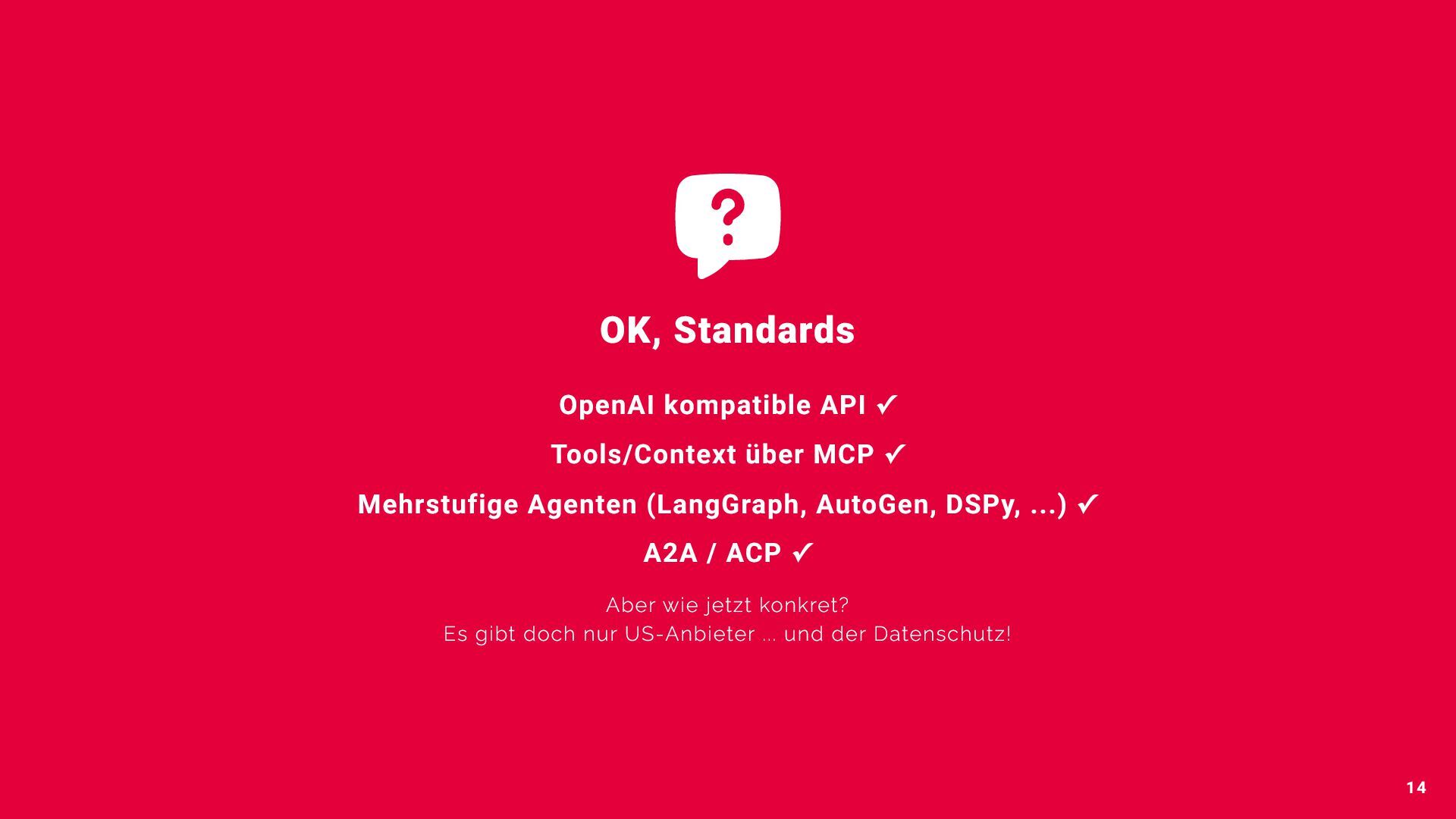 14. OK, Standards OpenAI kompatible API ✓ Tools/Context über MCP ✓