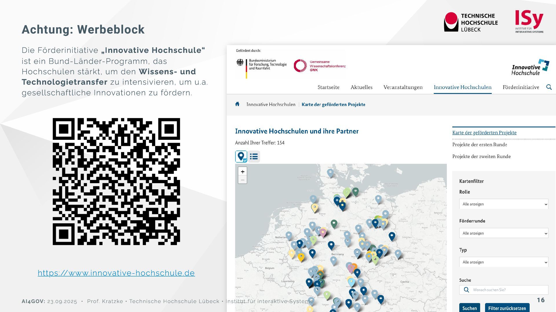 Hochschulen stärkt, um den Wissens- und Technologietransfer zu intensivieren, um u.a. gesellschaftliche Innovationen zu fördern. https://www.innovative-hochschule.de AI4GOV: 23.09.2025 • Prof. Kratzke • Technische Hochschule Lübeck • Institut für interaktive Systeme 16
