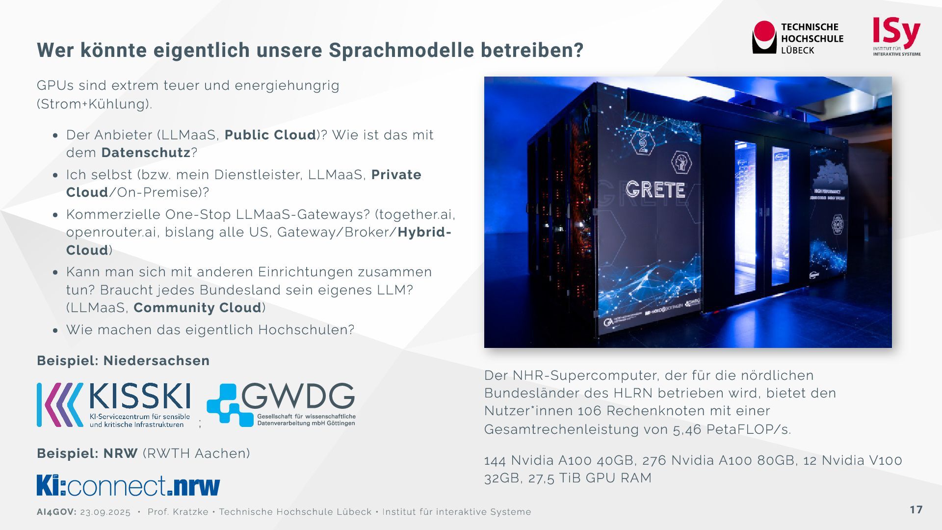 und energiehungrig (Strom+Kühlung). Der Anbieter (LLMaaS, Public Cloud)? Wie ist das mit dem Datenschutz? Ich selbst (bzw. mein Dienstleister, LLMaaS, Private Cloud/On-Premise)? Kommerzielle One-Stop LLMaaS-Gateways? (together.ai, openrouter.ai, bislang alle US, Gateway/Broker/Hybrid- Cloud) Kann man sich mit anderen Einrichtungen zusammen tun? Braucht jedes Bundesland sein eigenes LLM? (LLMaaS, Community Cloud) Wie machen das eigentlich Hochschulen? Beispiel: Niedersachsen ; Beispiel: NRW (RWTH Aachen) Der NHR-Supercomputer, der für die nördlichen Bundesländer des HLRN betrieben wird, bietet den Nutzer*innen 106 Rechenknoten mit einer Gesamtrechenleistung von 5,46 PetaFLOP/s. 144 Nvidia A100 40GB, 276 Nvidia A100 80GB, 12 Nvidia V100 32GB, 27,5 TiB GPU RAM AI4GOV: 23.09.2025 • Prof. Kratzke • Technische Hochschule Lübeck • Institut für interaktive Systeme 17
