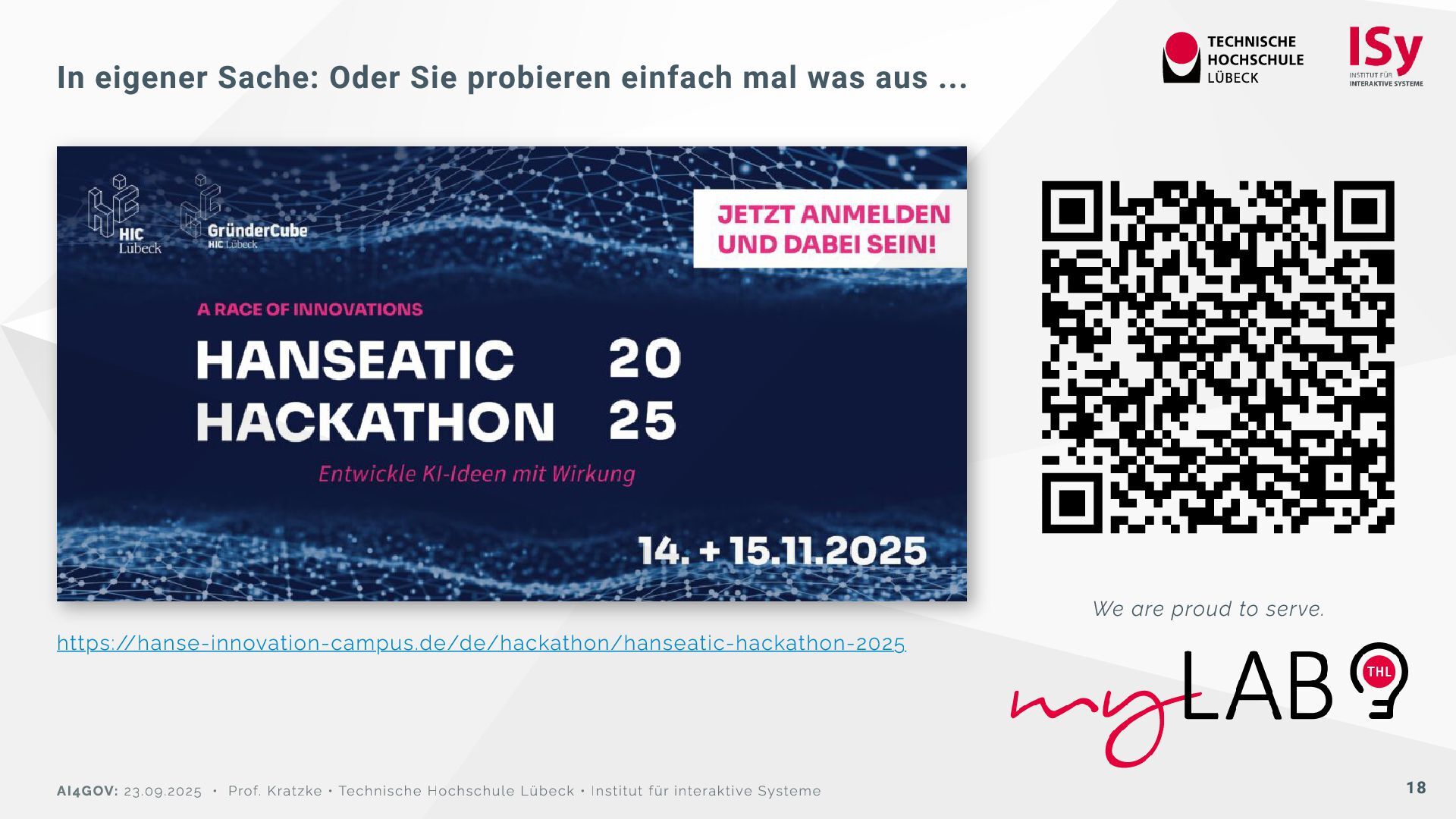 ... https://hanse-innovation-campus.de/de/hackathon/hanseatic-hackathon-2025 We are proud to serve. AI4GOV: 23.09.2025 • Prof. Kratzke • Technische Hochschule Lübeck • Institut für interaktive Systeme 18