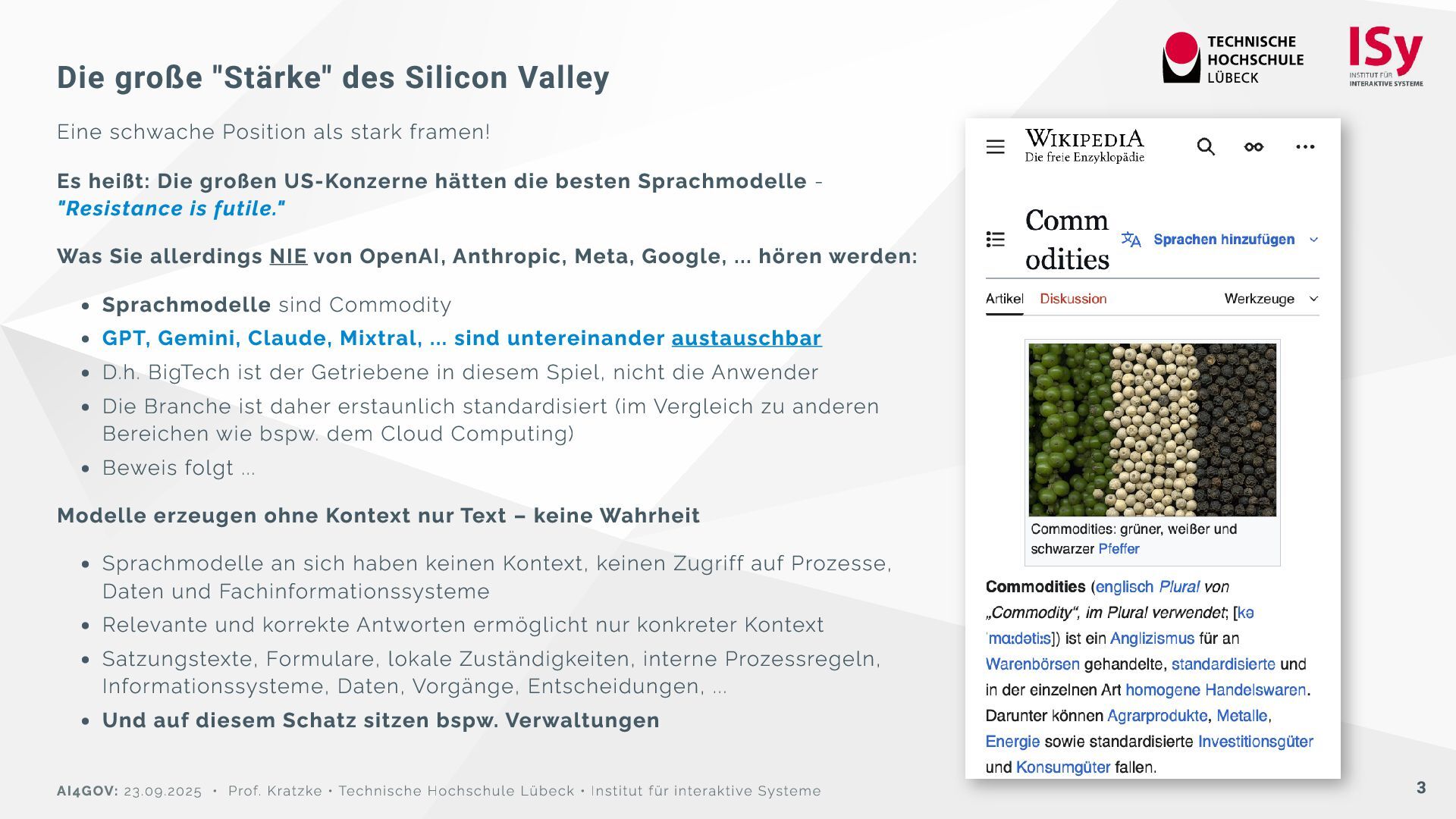 stark framen! Es heißt: Die großen US-Konzerne hätten die besten Sprachmodelle - "Resistance is futile." Was Sie allerdings NIE von OpenAI, Anthropic, Meta, Google, ... hören werden: Sprachmodelle sind Commodity GPT, Gemini, Claude, Mixtral, ... sind untereinander austauschbar D.h. BigTech ist der Getriebene in diesem Spiel, nicht die Anwender Die Branche ist daher erstaunlich standardisiert (im Vergleich zu anderen Bereichen wie bspw. dem Cloud Computing) Beweis folgt ... Modelle erzeugen ohne Kontext nur Text – keine Wahrheit Sprachmodelle an sich haben keinen Kontext, keinen Zugriff auf Prozesse, Daten und Fachinformationssysteme Relevante und korrekte Antworten ermöglicht nur konkreter Kontext Satzungstexte, Formulare, lokale Zuständigkeiten, interne Prozessregeln, Informationssysteme, Daten, Vorgänge, Entscheidungen, ... Und auf diesem Schatz sitzen bspw. Verwaltungen AI4GOV: 23.09.2025 • Prof. Kratzke • Technische Hochschule Lübeck • Institut für interaktive Systeme 3