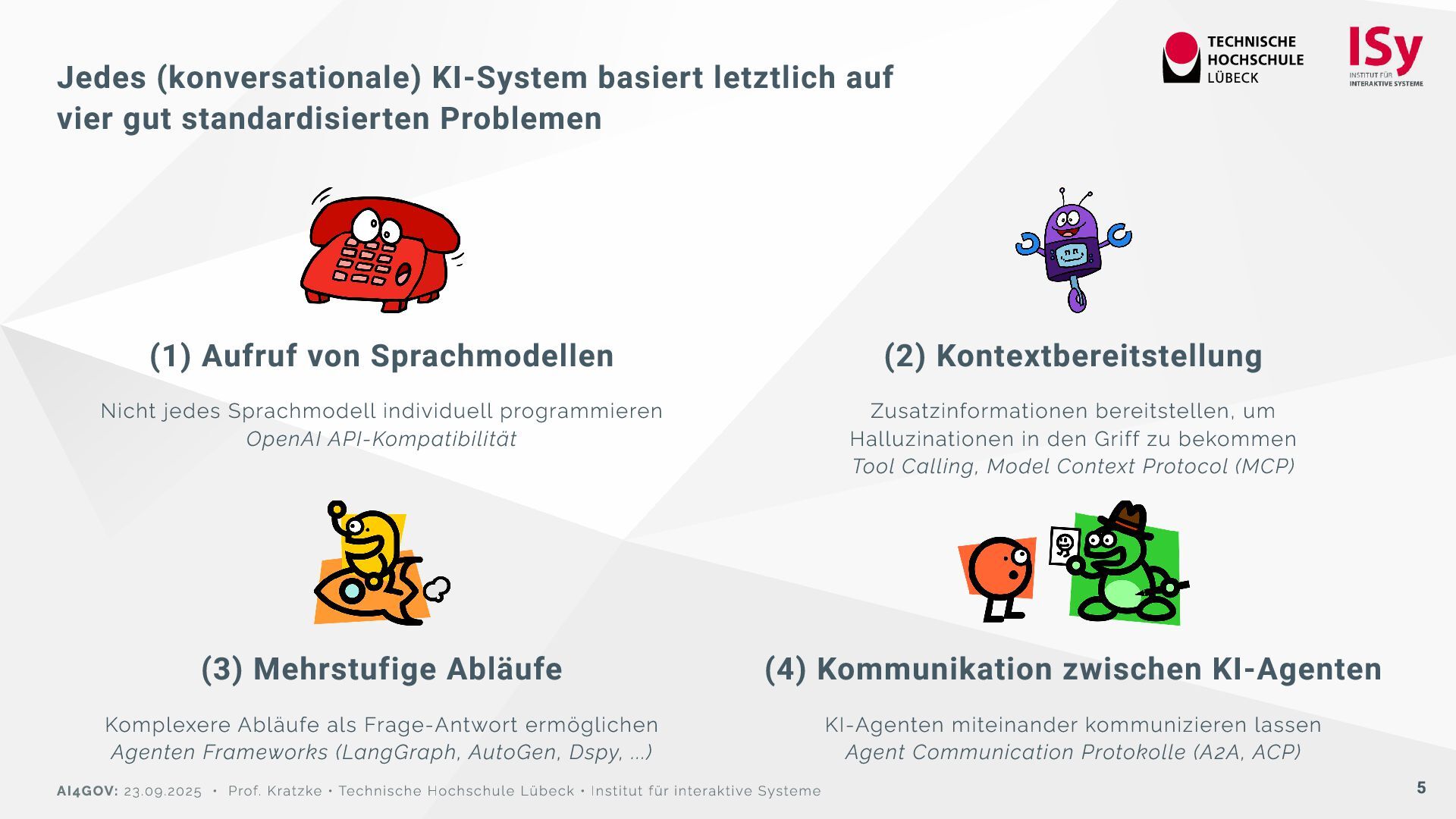 (1) Aufruf von Sprachmodellen Nicht jedes Sprachmodell individuell programmieren OpenAI API-Kompatibilität (2) Kontextbereitstellung Zusatzinformationen bereitstellen, um Halluzinationen in den Griff zu bekommen Tool Calling, Model Context Protocol (MCP) (3) Mehrstufige Abläufe Komplexere Abläufe als Frage-Antwort ermöglichen Agenten Frameworks (LangGraph, AutoGen, Dspy, ...) (4) Kommunikation zwischen KI-Agenten KI-Agenten miteinander kommunizieren lassen Agent Communication Protokolle (A2A, ACP) AI4GOV: 23.09.2025 • Prof. Kratzke • Technische Hochschule Lübeck • Institut für interaktive Systeme 5